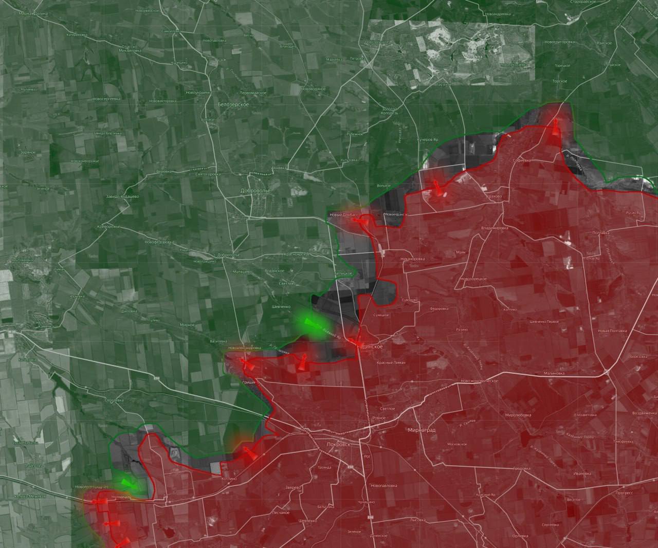 От Гришино российские войска продвигаются на север в район н.п. Шевченко, формируя «карман» юго-западнее Родинского».