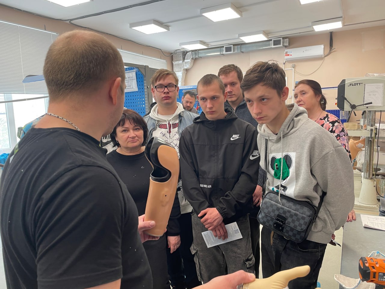 Отдельное внимание уделили процессу изготовления различных видов протезов и других ортопедических изделий. Ребята узнали, что такое временная и постоянная культиприёмная гильза, как они изготавливаются и обрабатываются. Где прячутся проводки в бионическом протезе руки студентам рассказали техники-протезисты цеха и объяснили, как настраивается коленный модуль в протезе ноги с микропроцессорным управлением.