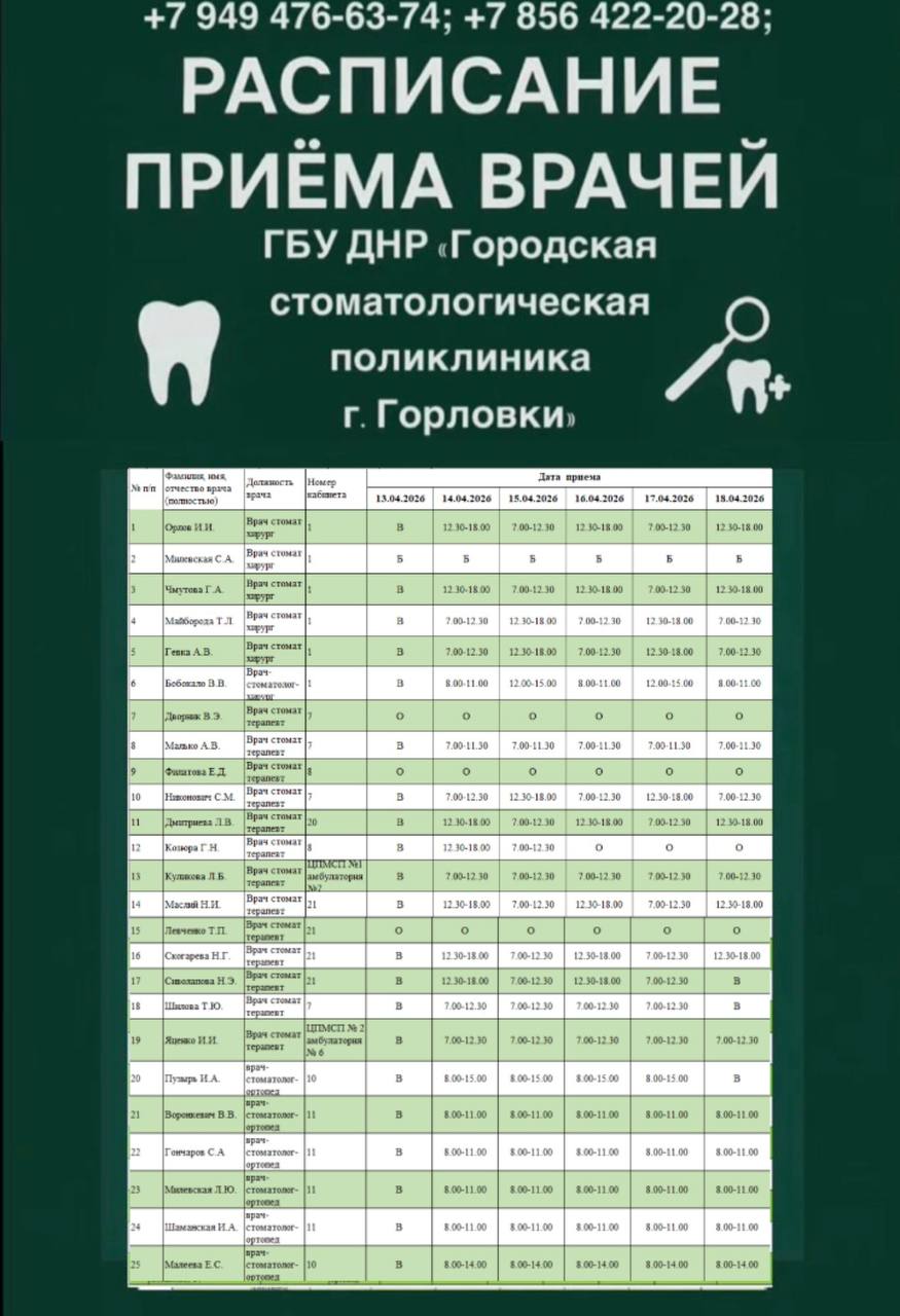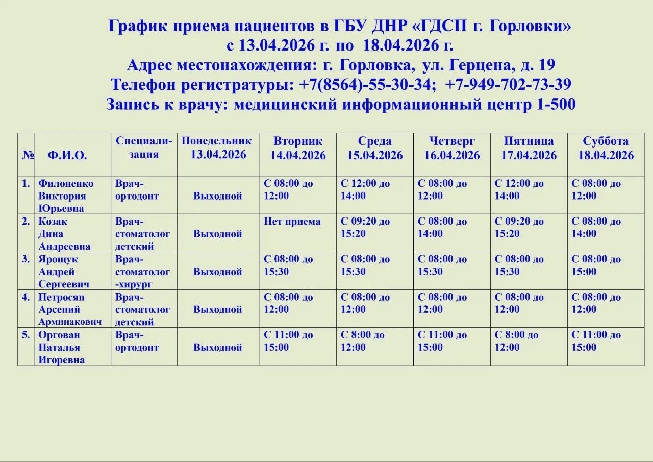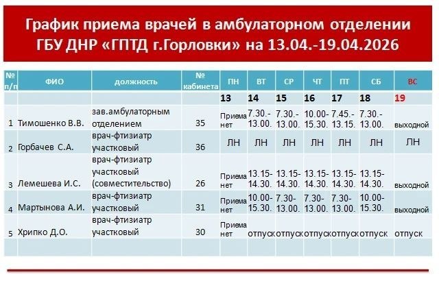 Иван Приходько: График работы специалистов ГБУ ДНР «ГДСП г.Горловки», ГБУ ДНР «Городской наркологический диспансер г. Горловки», ГБУ ДНР «ГПБ г. Горловки», ГБУ ДНР «ГПТД г.Горловки», ГБУ ДНР «ГДВД г.Горловки», ГБУ ДНР «ГСП...