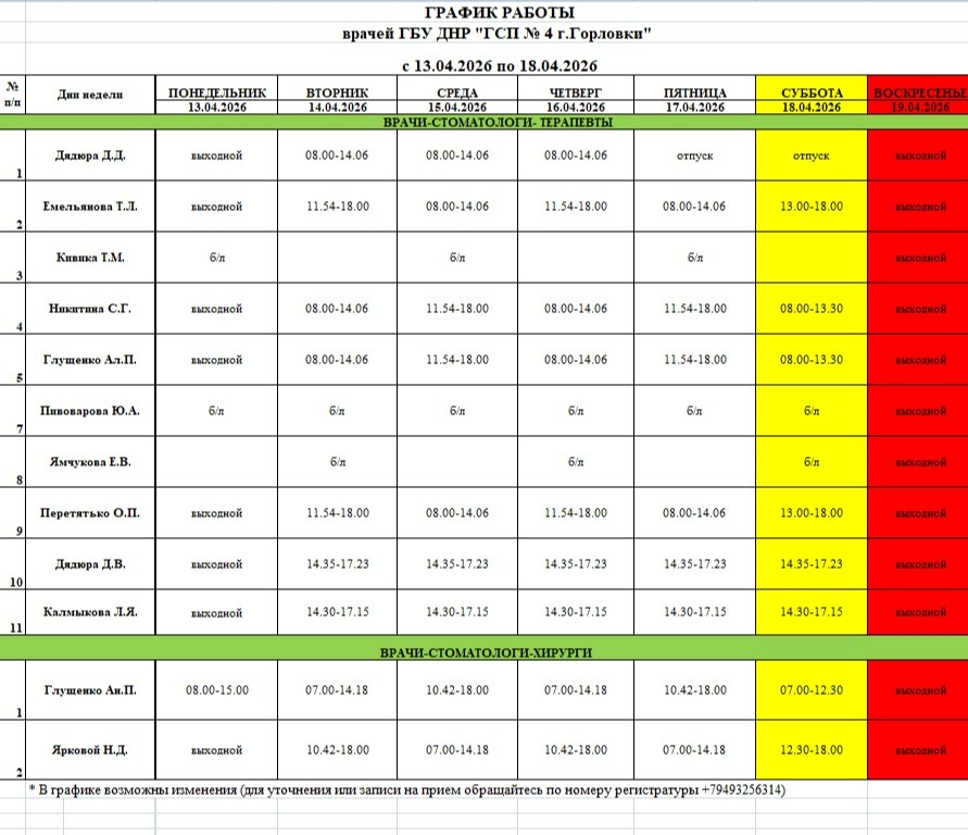 График работы специалистов ГБУ ДНР «ГДСП г.Горловки», ГБУ ДНР «Городской наркологический диспансер г. Горловки», ГБУ ДНР «ГПБ г. Горловки», ГБУ ДНР «ГПТД г.Горловки», ГБУ ДНР «ГДВД г.Горловки», ГБУ ДНР «ГСП г.Горловки», ГБУ ДНР «ГОД г. Горловки», ГБУ ДНР «ГСП № 4 г.Горловки», ГБУ ДНР «ЦОМД г. Горловки»