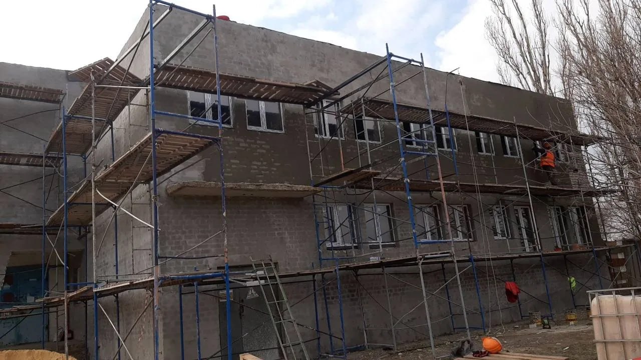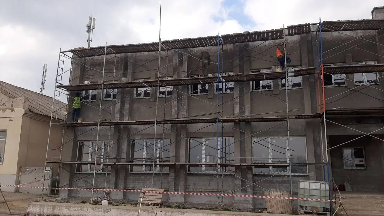По всей фасадной части установлены леса и начаты работы по дефектовке внешних стен. На подготовленных участках идет оштукатуривание.