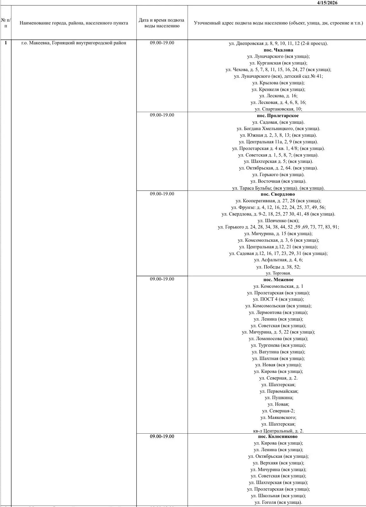 Сегодня, 15 апреля, в Макеевке будет организован подвоз воды для жителей, в дома которых не поступила вода в установленный графиком день.