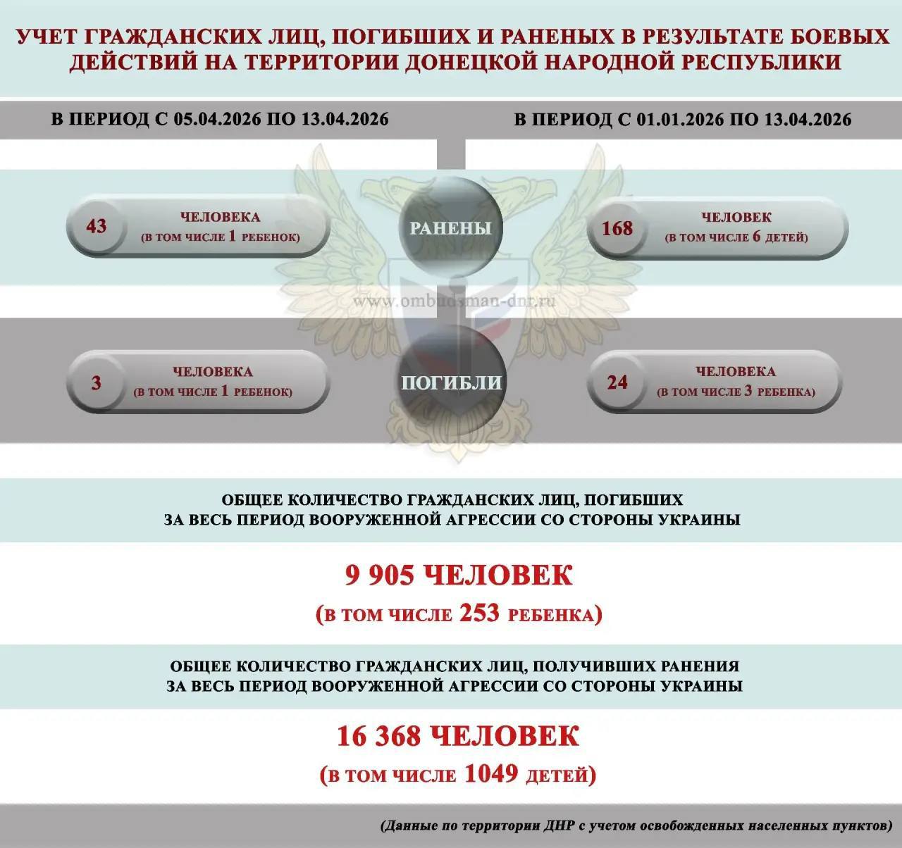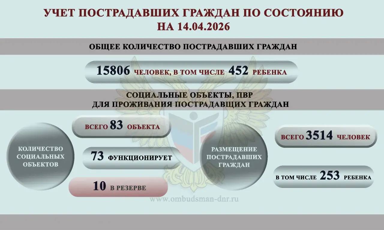 ОБЗОР СОЦИАЛЬНО-ГУМАНИТАРНОЙ СИТУАЦИИ, СЛОЖИВШЕЙСЯ НА ТЕРРИТОРИИ ДОНЕЦКОЙ НАРОДНОЙ РЕСПУБЛИКИ ВСЛЕДСТВИЕ ВОЕННЫХ ДЕЙСТВИЙ В ПЕРИОД С 7 ПО 13 АПРЕЛЯ 2026 Г.