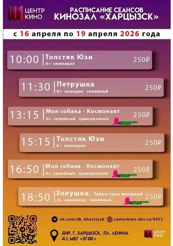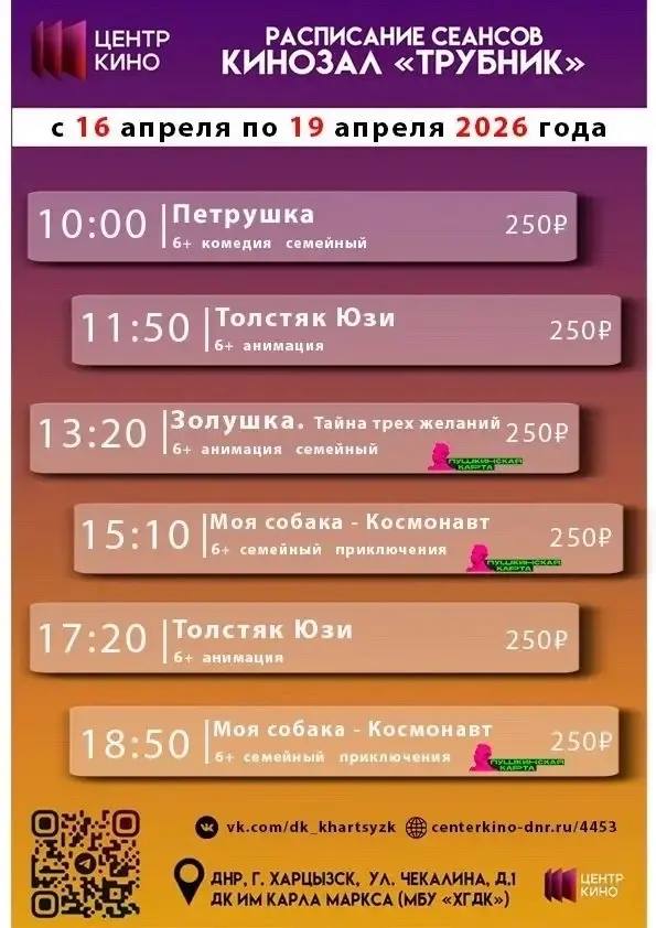 Расписание сеансов в кинотеатрах «Харцызск» и «Трубник» с 16 по 19 апреля 2026 года
