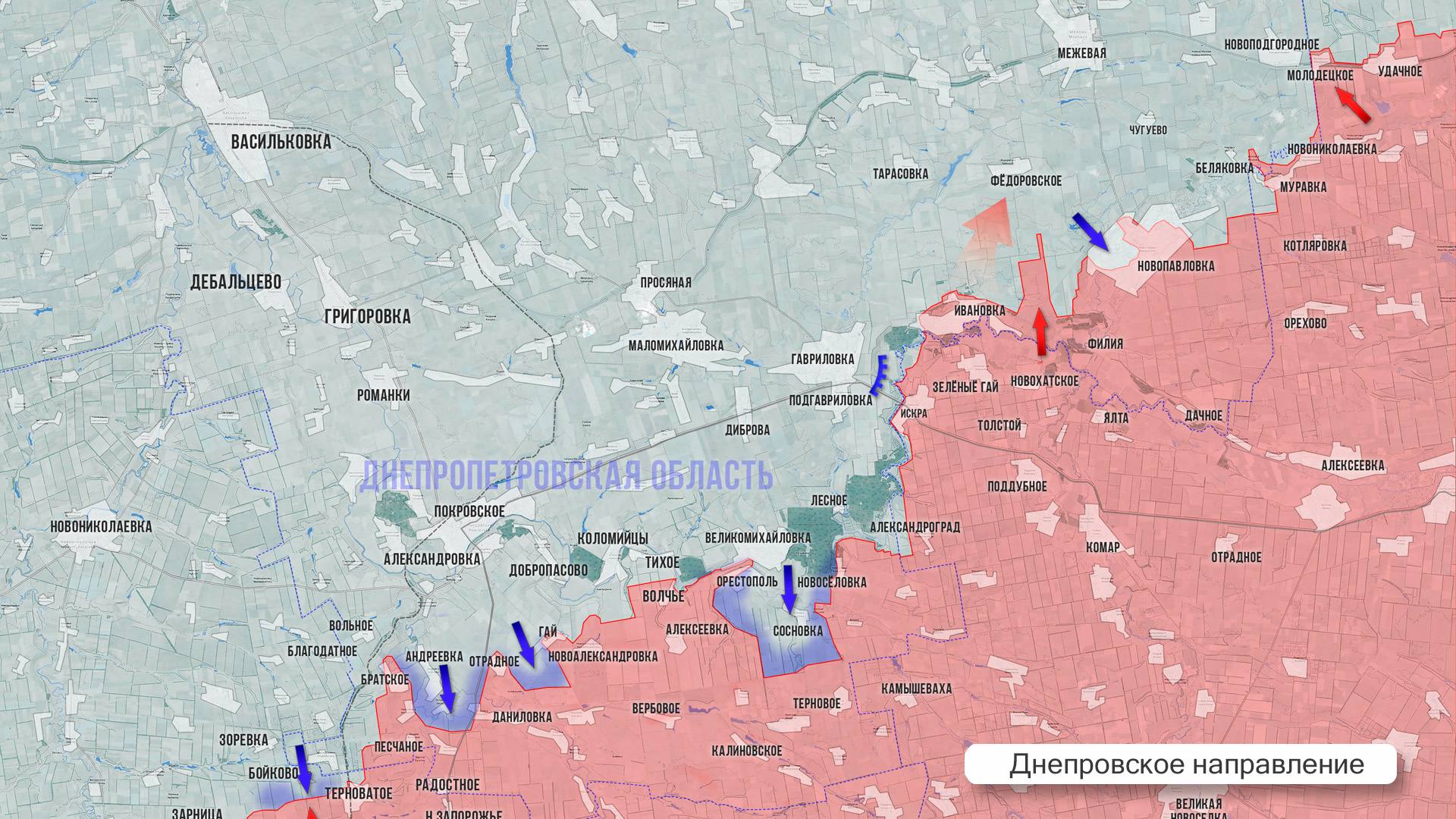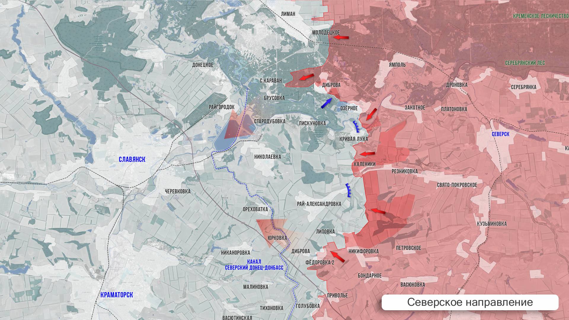 На Северском направлении не стихают бои в районе Дибровы, Фёдоровки Второй и Никифоровки. ВСУ продолжают яростно контратаковать, удерживая южные рубежи Рай-Александровки. ВС РФ зачистили большой «карман» к северо-востоку от Каленков и выровняли фронт по линии Каленики – Кривая Лука.