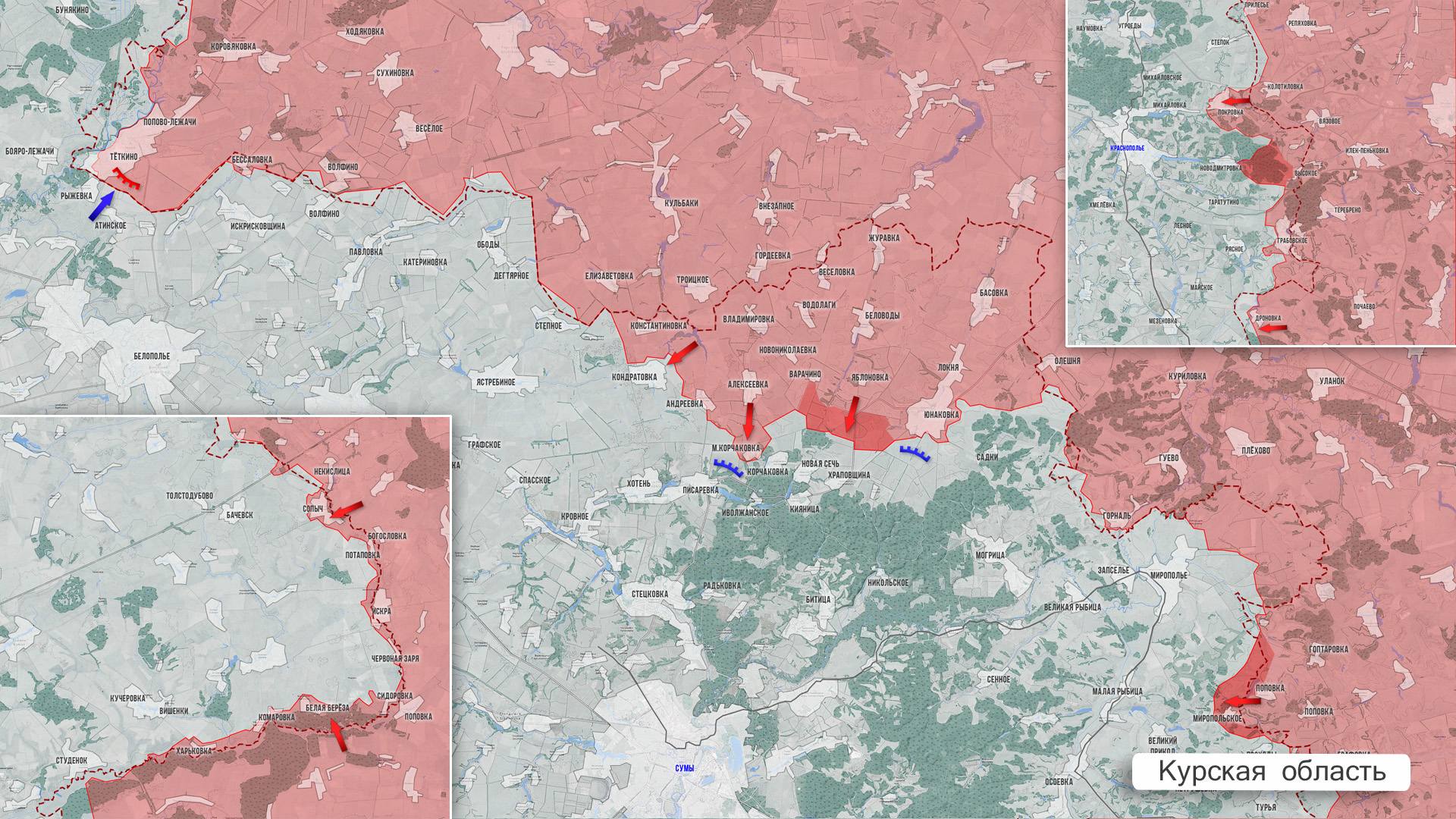 В Сумском приграничье ВСУ признают, что за последнее время на участке от Грабовского до Миропольского ВС РФ взяли под контроль более 150 кв.км. территории и продолжают продвигаться. Не стихают бои в районе Корчаковки. На Глуховском участке наши дроноводы наносят удары по расчётам БПЛА и логистике ВСУ в Глухове.