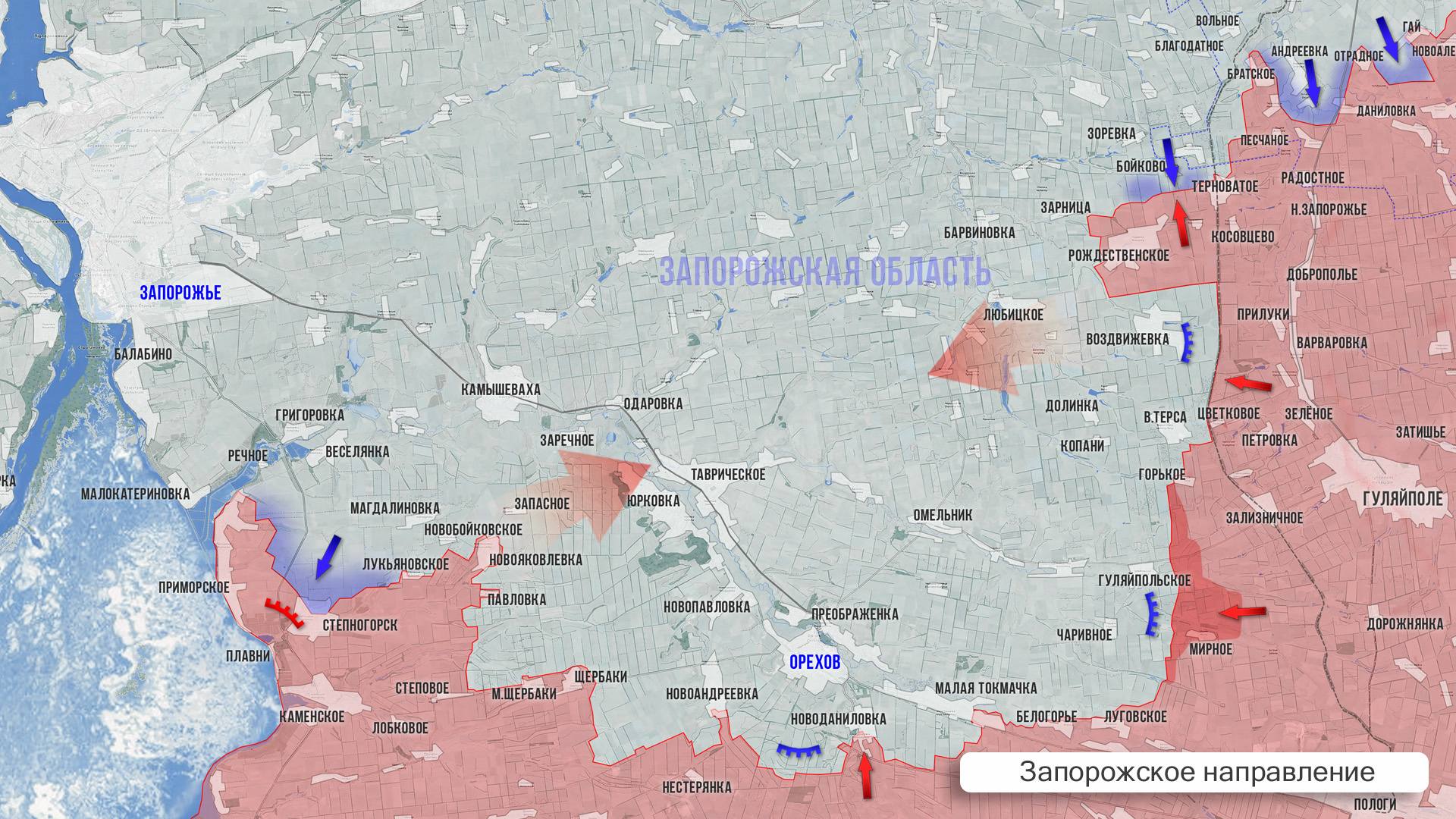 На Запорожском участке ситуация тяжёлая, ВСУ постепенно сдвигает линию фронта на западном фланге. Появляются сообщения о стрелковых боях между Степногорском и Приморским, где враг пытается отрезать наш гарнизон в Приморском от основных сил. К сожалению, на этом участке ВСУ перехватывают инициативу и пытаются выровнять фронт. На восточном фланге относительное затишье. К югу от Воздвижевки наши военные стараются продвинуться дальше на запад и вклиниться глубже в оборону противника, охватить Воздвижевку и Верхнюю Терсу с тыла.