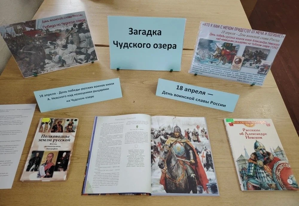 В преддверии Дня воинской славы России в библиотеке-филиале для детей №4 (пгт Пелагеевка) оформлена книжная выставка "Загадка Чудского озера", посвящённая победе русских воинов над немецкими рыцарями на Чудском озере (18 апреля 1242 года).