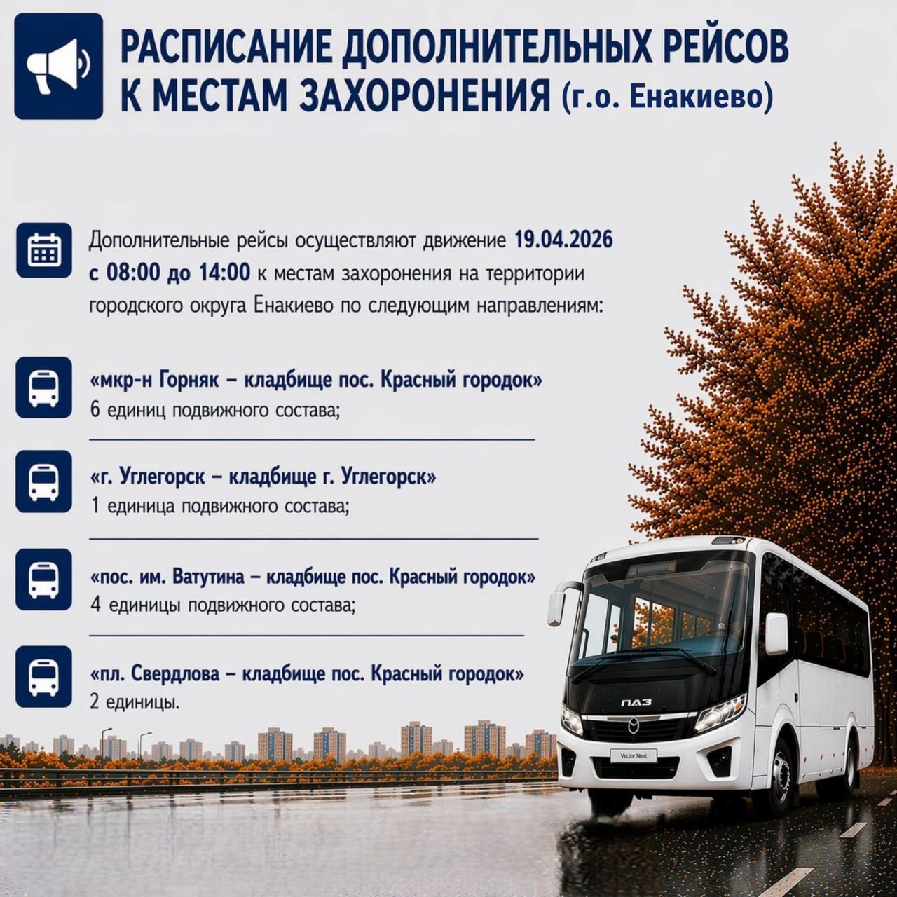 Ознакомиться с графиком движения автобусных рейсов в направлении мест захоронения можно в информационных карточках .