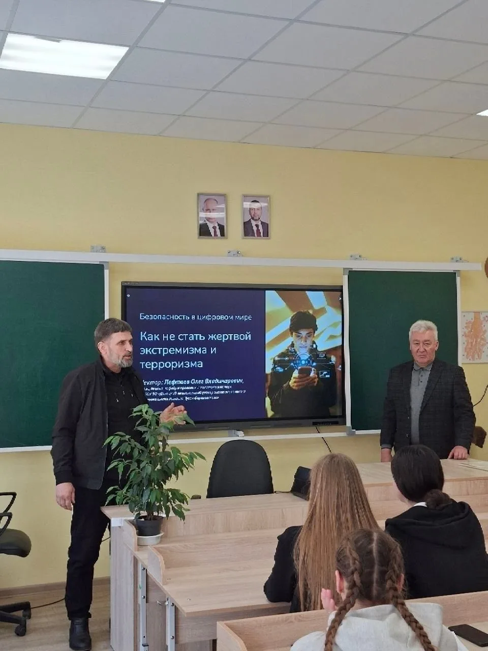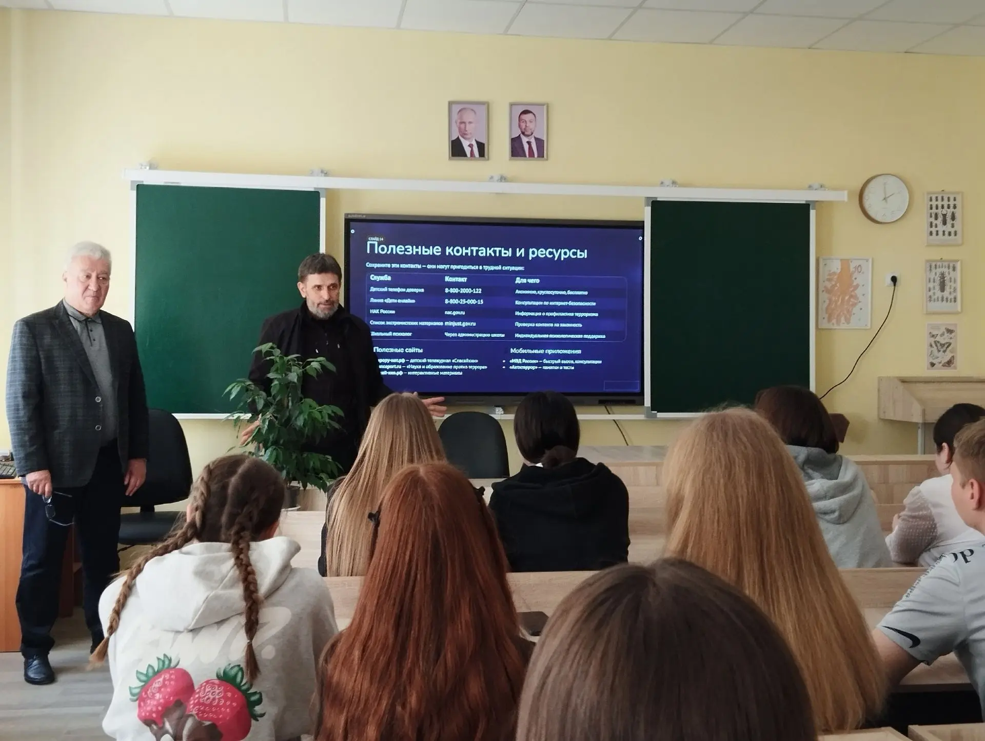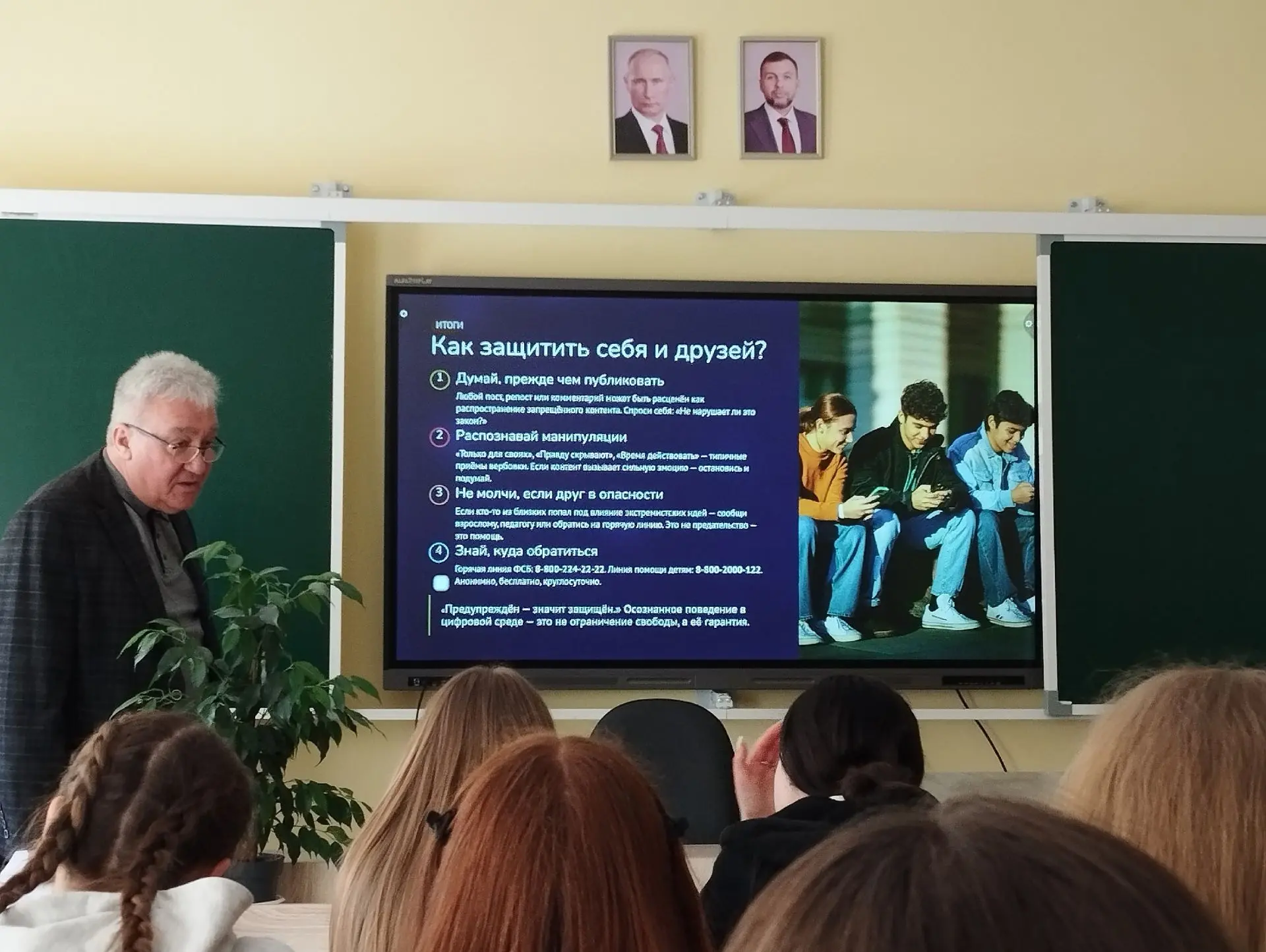 16 апреля в рамках нацпроекта "Молодежь и дети" в Комсомольской школе № 5 состоялась встреча учащихся 9-11 классов с Олегом Пефтиевым, кандидатом юридических наук, доцентом кафедры правовых и политических наук Донецкого национального университета экономики и торговли им. Михаила Туган-Барановского. В рамках лекции и обсуждения документального фильма «Предательство», организаторы представили школьникам практическое руководство по безопасному поведению в цифровом пространстве.