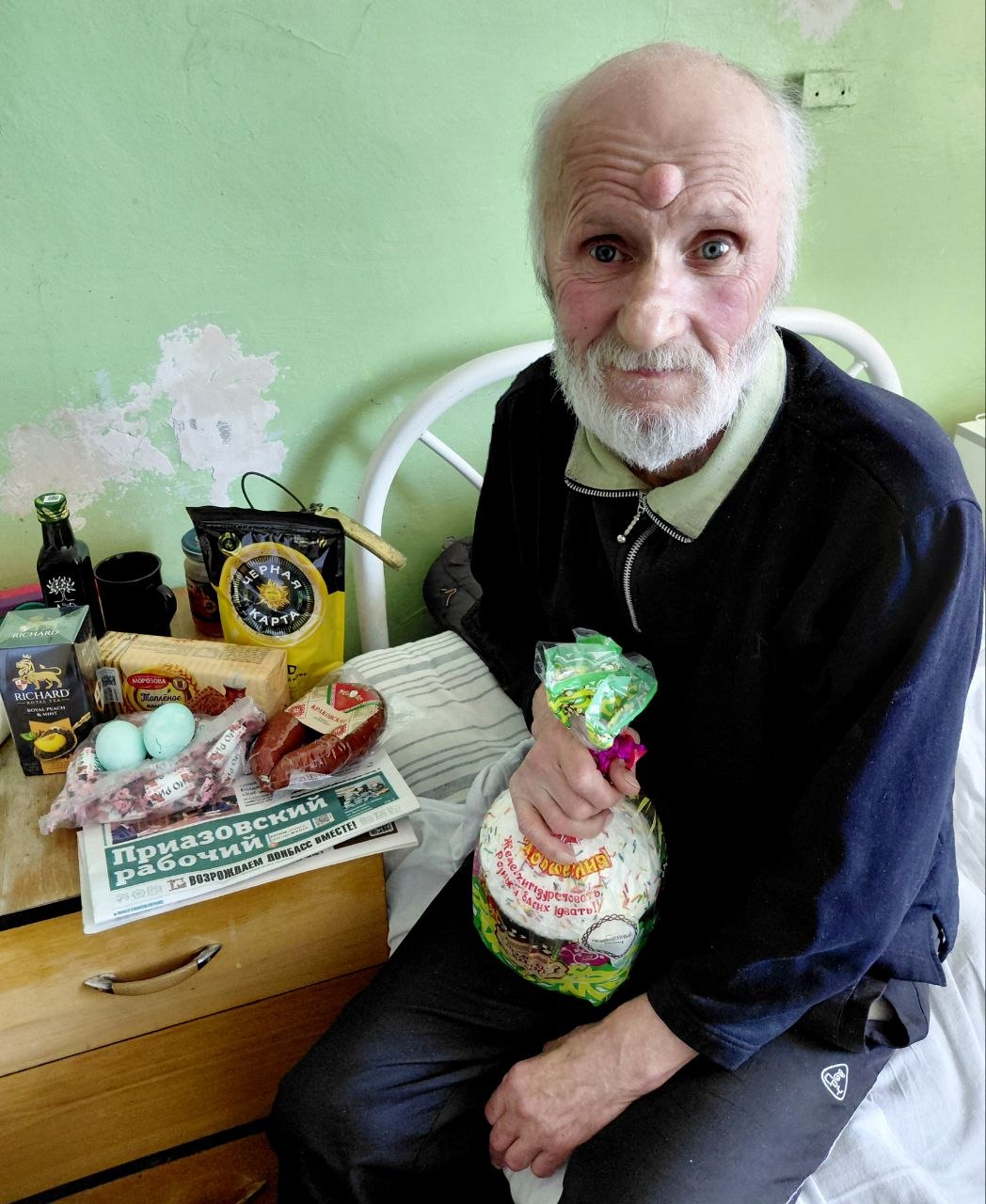 Мы решили поздравить с Пасхой тех, кто находится под нашей опекой. Наталье Пригонец и ее соседям по общежитию, Людмиле и незрячей бабушке Тамаре, привезли куличи, яйца и сладости. Валентину Константиновичу, лежащему в больнице, – пасхальный набор и продукты, чтобы разнообразить его рацион. Жильцам ПВР доставили продукты, собранные мариупольцами. В Светлую седмицу мы тоже решили порадовать людей, которые нашли временный приют в ПВР.