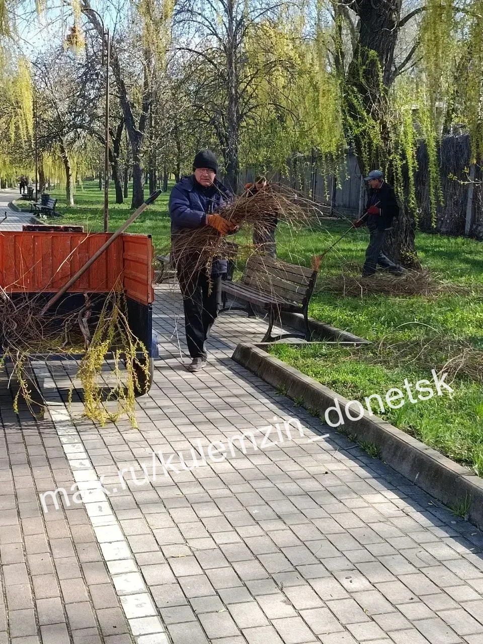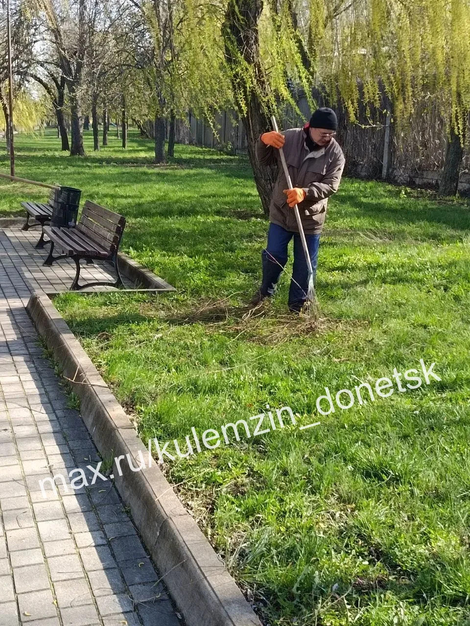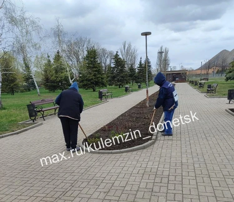 Работники убирают старую листву и сухостой, готовят газоны под высадку зелёных насаждений, подметают аллеи, а также красят скамейки.