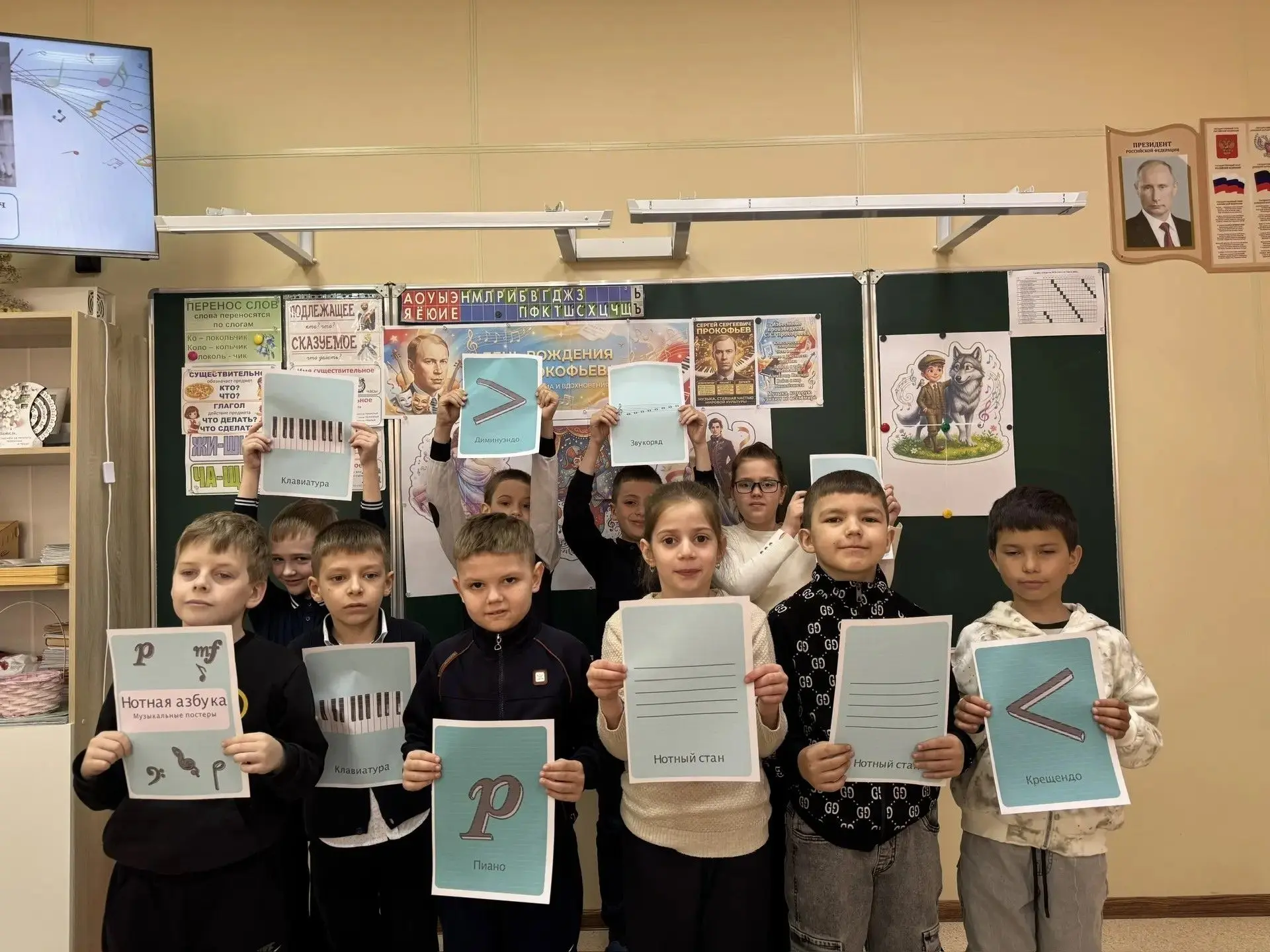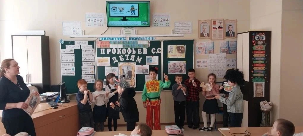 Параллельно, во 2-х классах школы прошло мероприятие «В гостях у «Солнечного гения». Второклассники узнали о музыкальном наследии Сергея Прокофьева через презентацию и просмотр знаменитой симфонической сказки «Петя и волк». Анимационный фильм, в котором персонажи представлены музыкальными инструментами, позволил детям изучить звучание флейты, гобоя, кларнета, фагота, валторны и струнных. В завершение мероприятия ученики проверили свои знания в викторине.