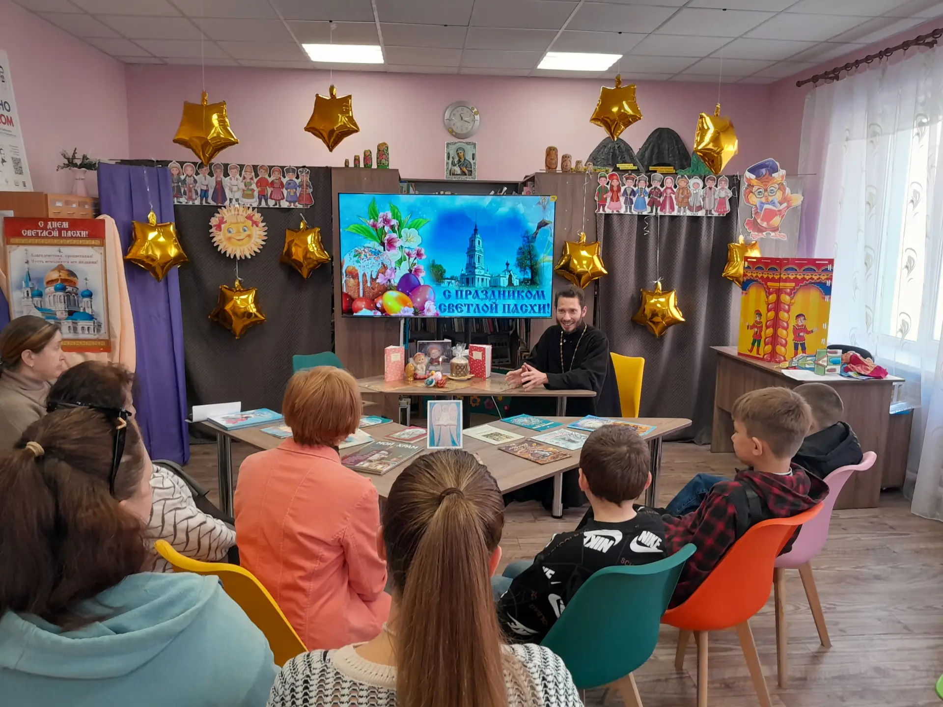 Пасха - один из главных православных праздников. Для читателей детской библиотеке-филиал сотрудники подготовили час православия «Пасха-день святых чудес». Гостем мероприятия стал настоятель Свято-Александро-Невского храма протоиерей о. Владислав. Батюшка рассказал о глубоком смысле Светлого Христова Воскресения, коснулся других традиций, связанных с этим великим торжеством: почему принято дарить крашеные яйца, кому было подарено первое яйцо. Отец Владислав подарил всем участникам мероприятия пасхальные яйца, сделанные с любовью воспитанниками Воскресной школы Свято-Александро-Невского храма к празднику Пасхи, а также ароматные куличи.