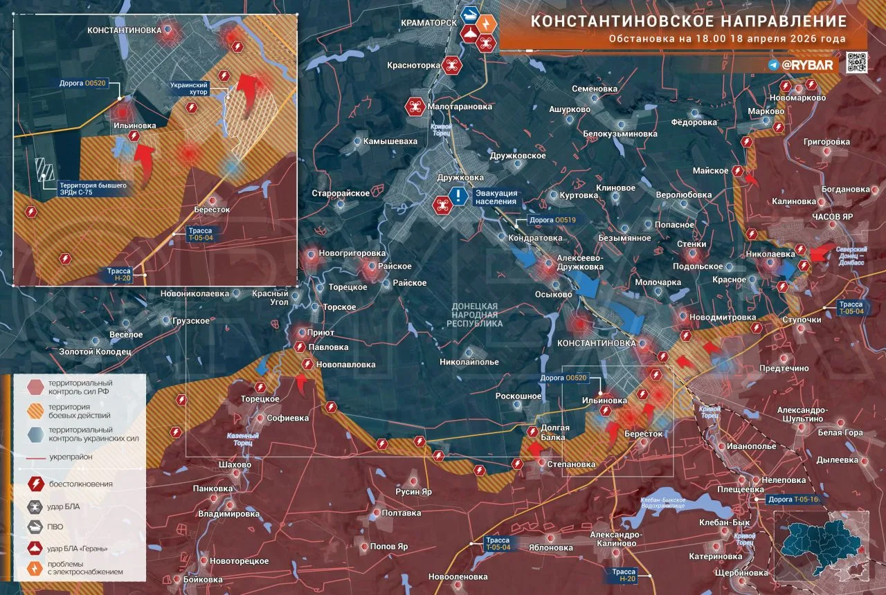 На Константиновском направлении ВС РФ продолжают вести тяжелые бои как в самом городе, так и на его флангах. Восточнее ВСУ удерживают окраины Часова Яра, без контроля над которым невозможен охват Константиновки с северо-востока.