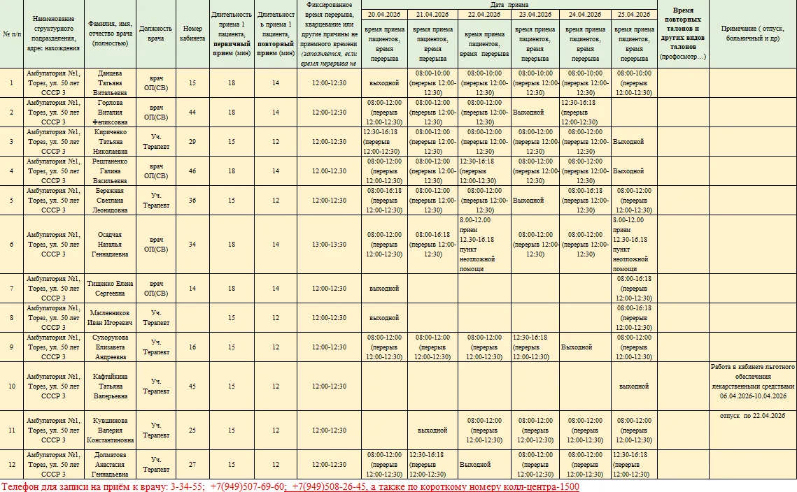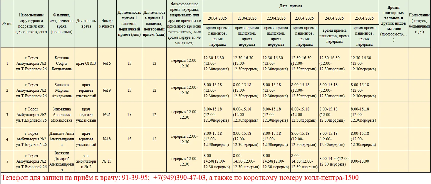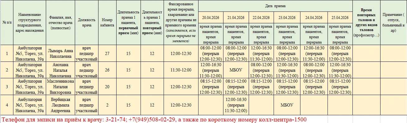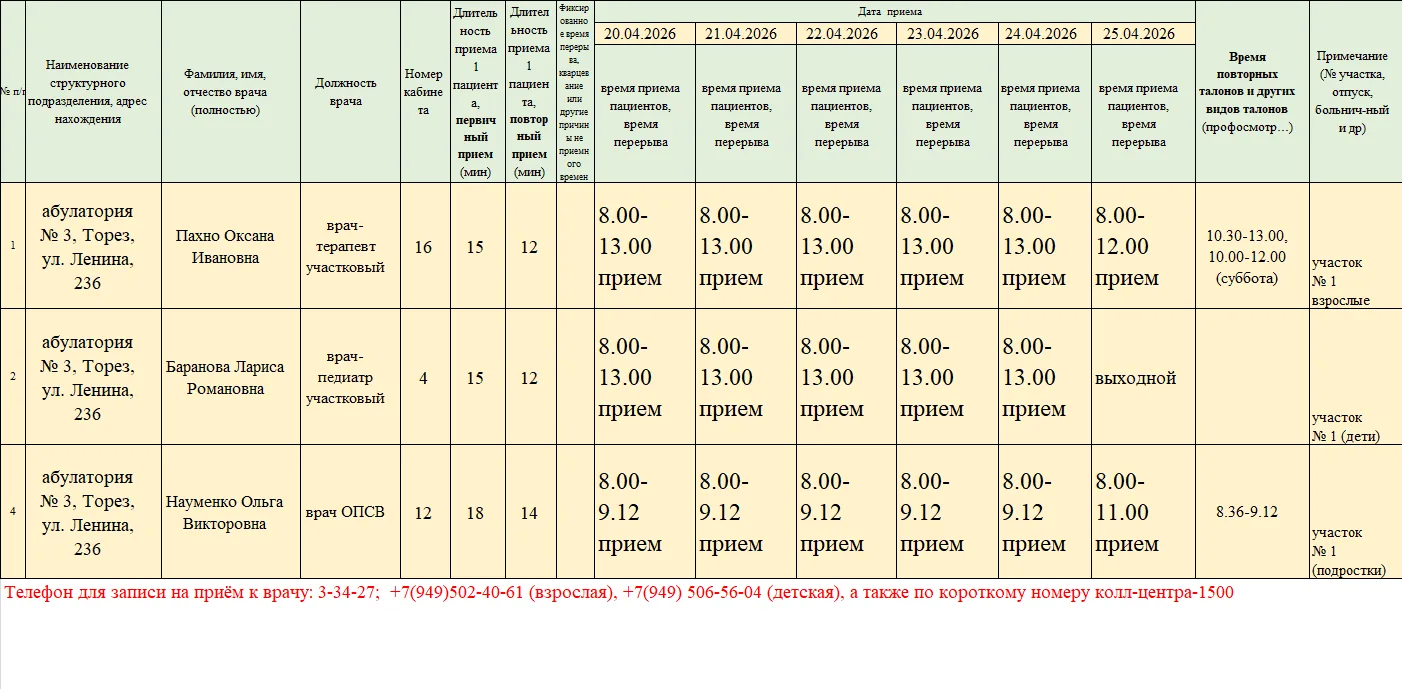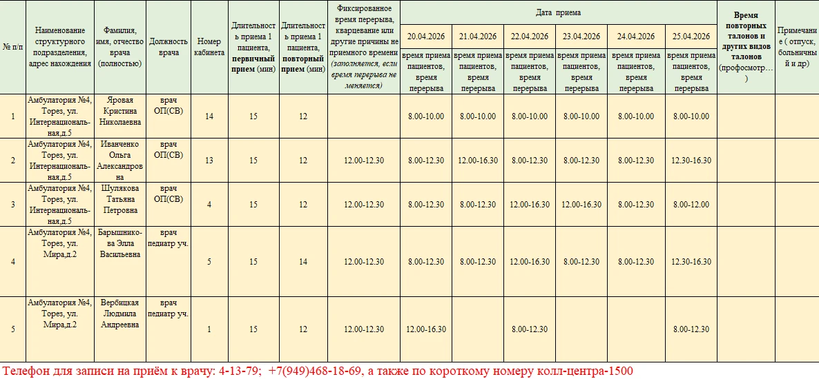 В рамках работы муниципального штаба по вопросам здравоохранения при администрации городского округа Торез, который был создан по поручению Главы ДНР Дениса Пушилина, администрация городского округа Торез информирует о графике приема пациентов врачами ГБУ ДНР "ЦГБ г.Тореза" с 20.04.2026- 25.04.2026
