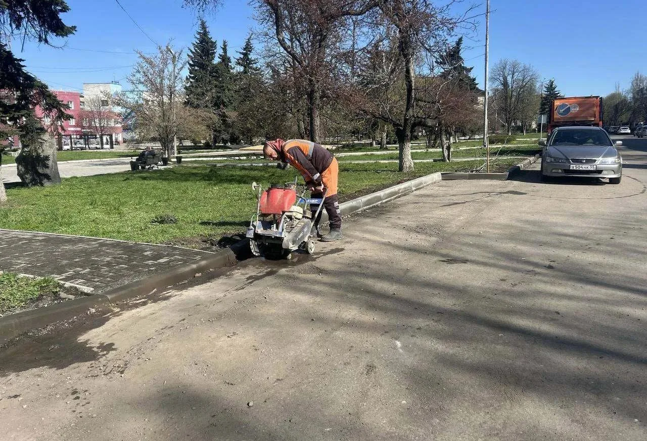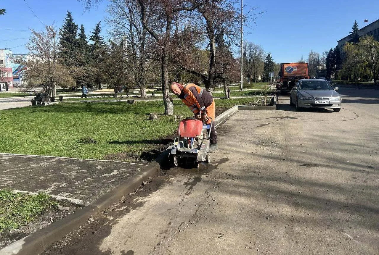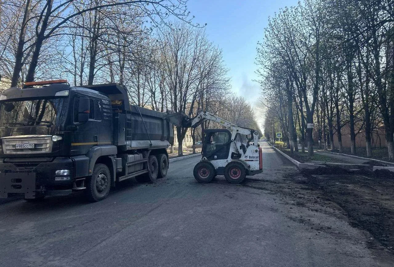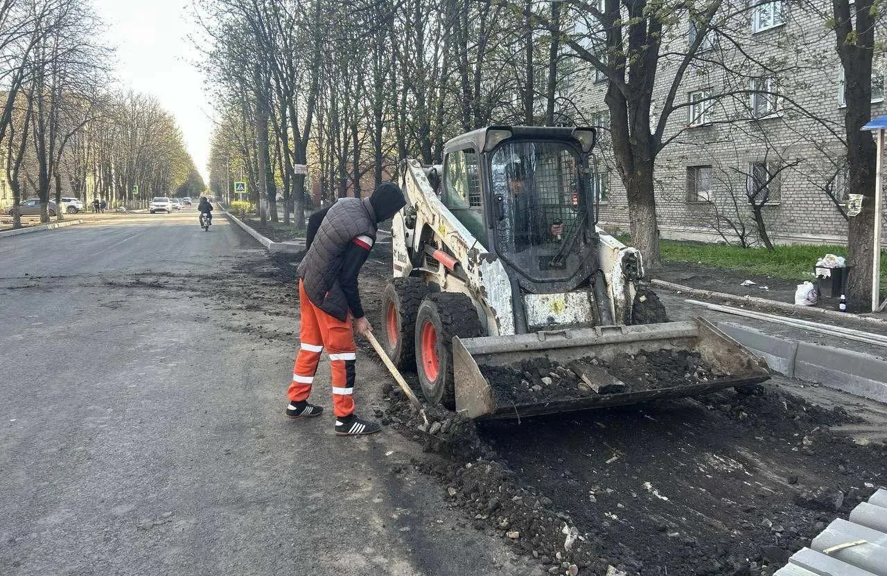 Участок уже частично покрыт новым дорожным покрытием с бордюрами на месте.