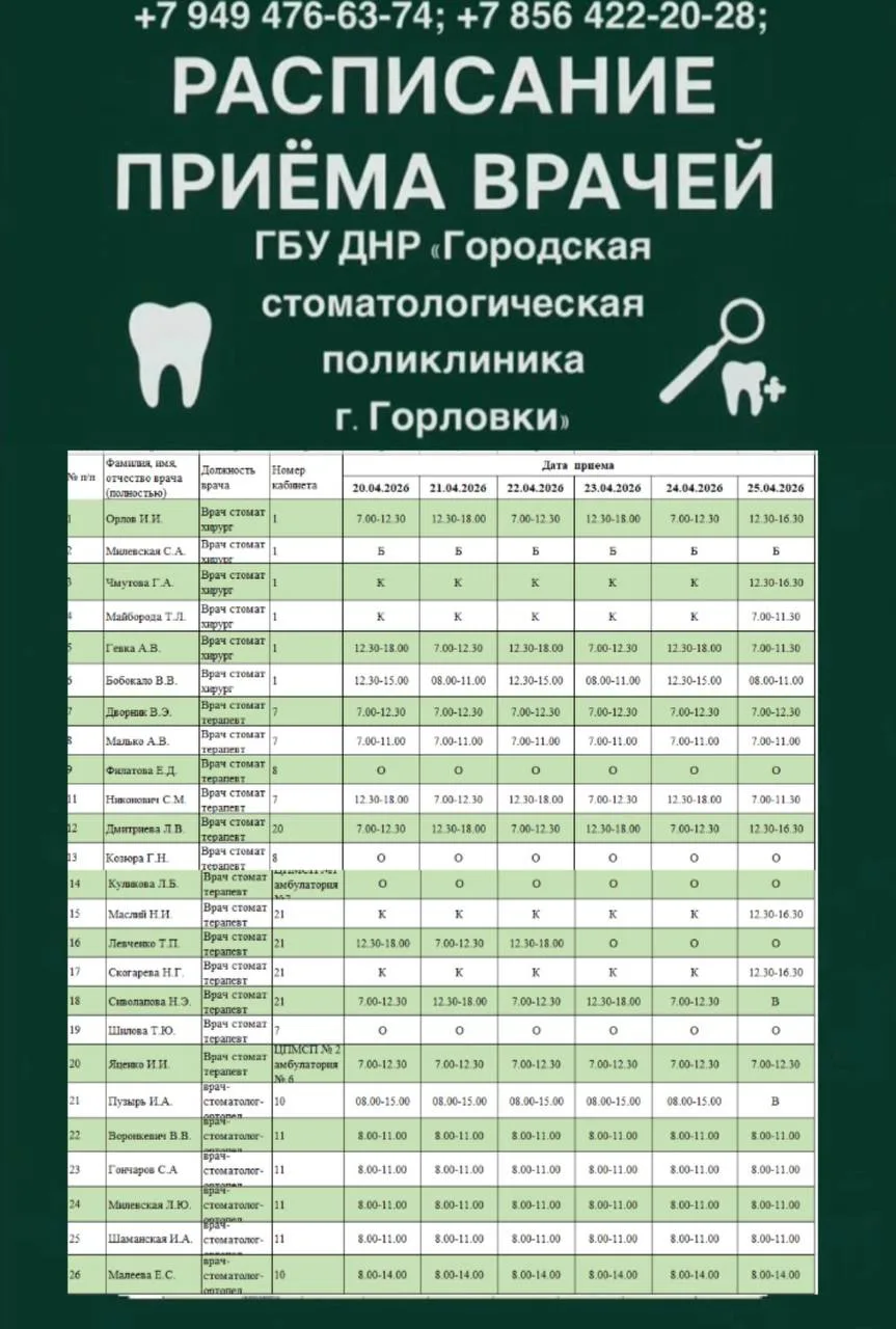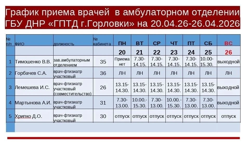 Иван Приходько: График работы специалистов ГБУ ДНР «ГДСП г.Горловки», ГБУ ДНР «Городской наркологический диспансер г. Горловки», ГБУ ДНР «ГПБ г. Горловки», ГБУ ДНР «ГПТД г.Горловки», ГБУ ДНР «ГДВД г.Горловки», ГБУ ДНР «ГСП...