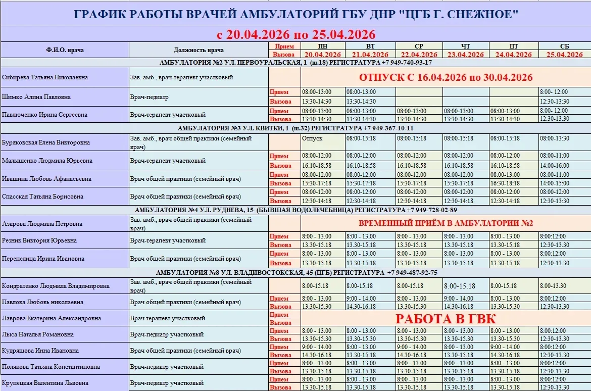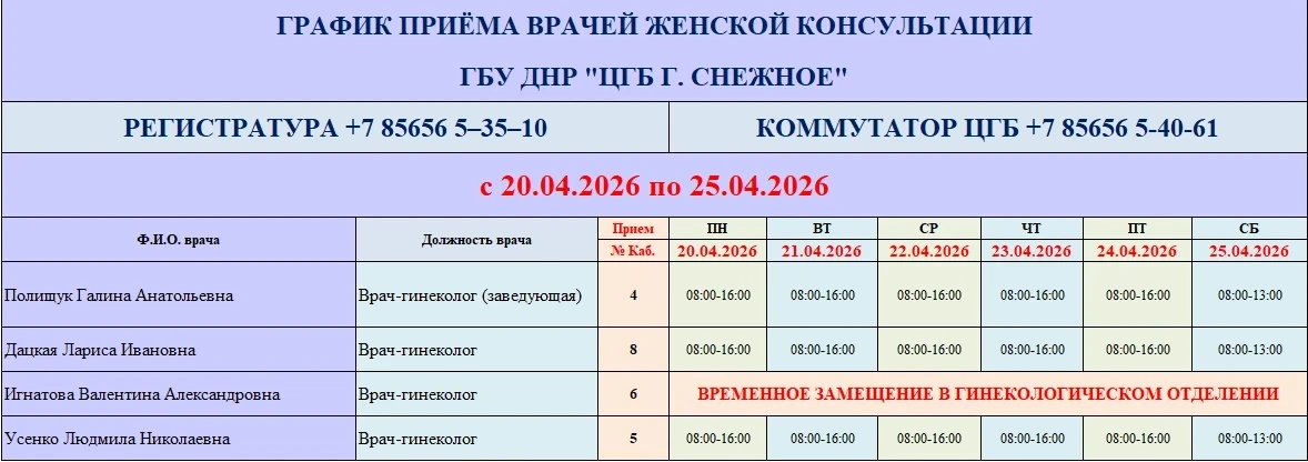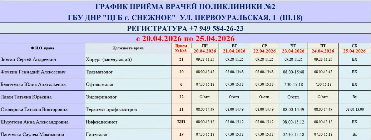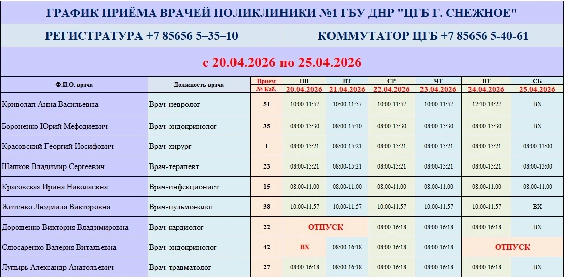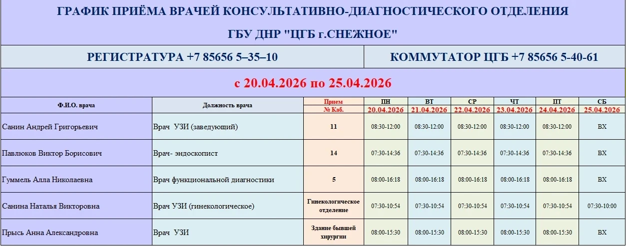 График работы врачей ГБУ ДНР «ЦГБ г. Снежное»