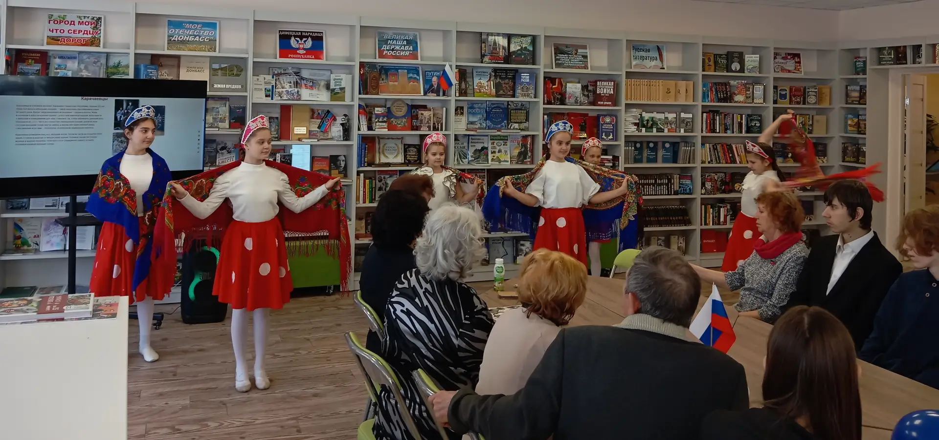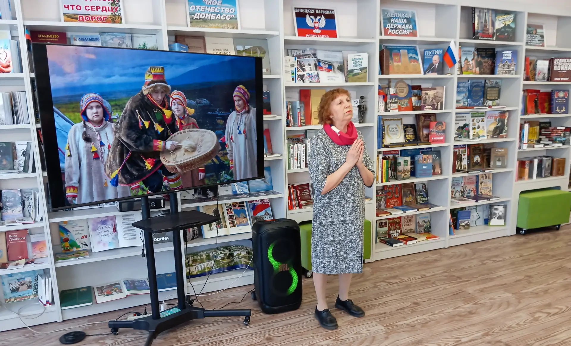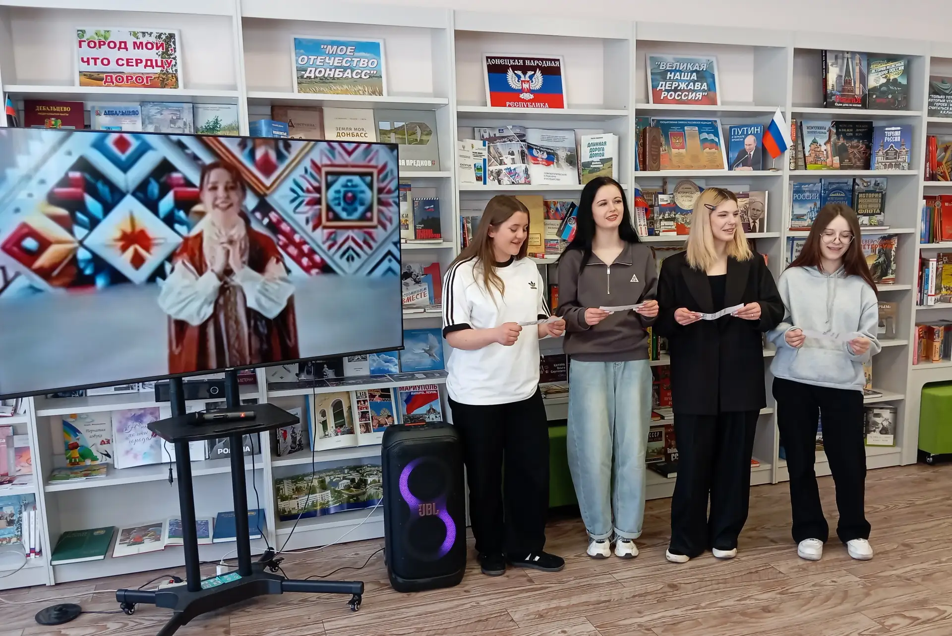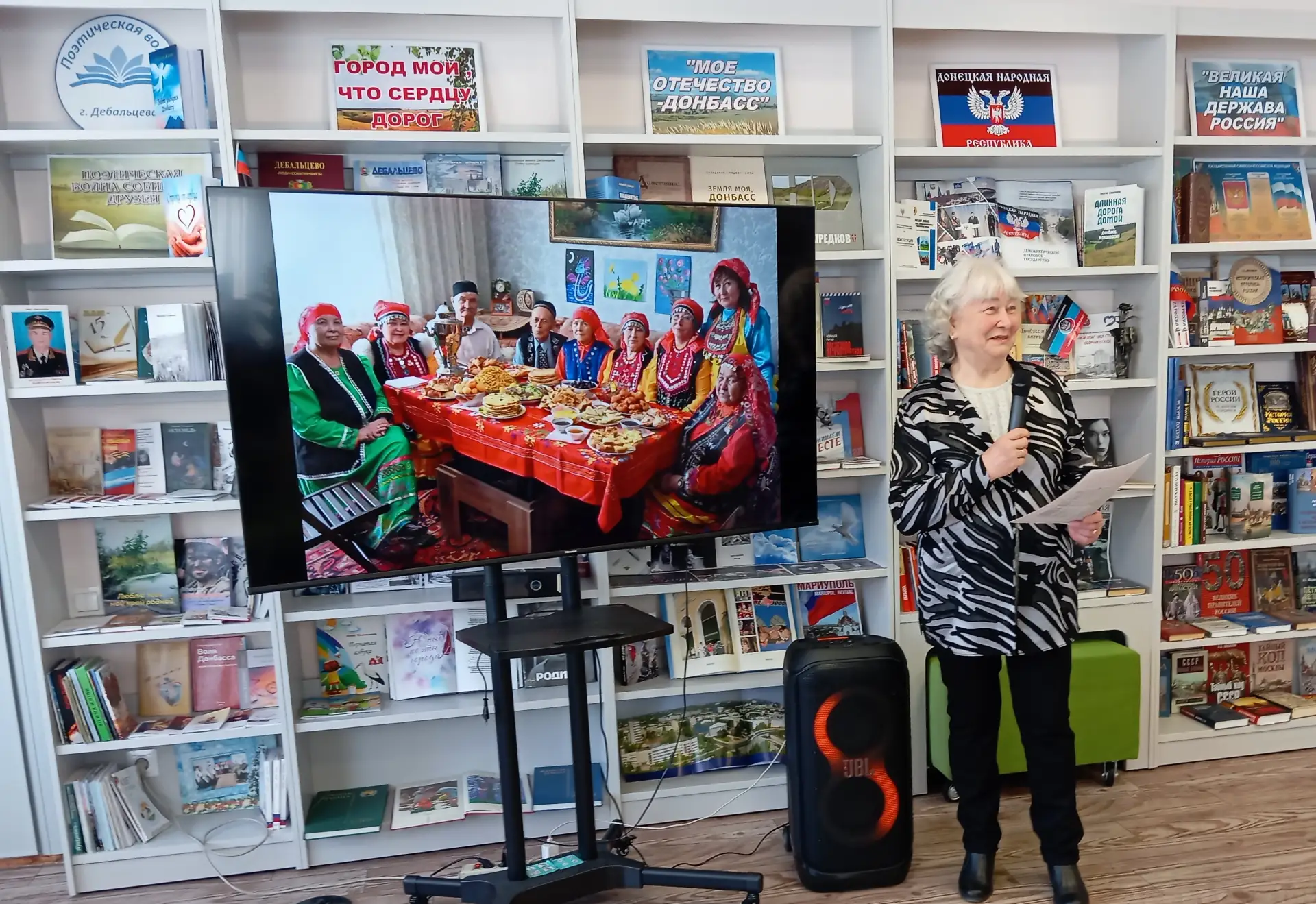 Обучающиеся ГБОУ «Школа № 5 г. о. Дебальцево», пользователи библиотеки в ходе мероприятия прослушали интересные сообщения о народах России: башкирах, казахах, вожанах, саамах, русском народе, которые сопровождались презентацией «Народы России», демонстрацией видеороликов о национальных танцах в исполнении национальных фольклорных коллективов, интерактивной викториной «Живи и славься, Русь святая!». Как говорится: «В песнях поет душа народа, а в танцах отражаются культура и традиции».