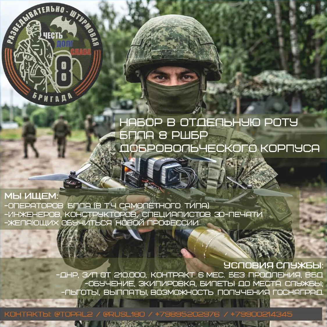 Отдельная рота БПЛА 8 РШБр, выполняющая задачи в зоне проведения СВО, объявляет о наборе добровольцев для обучения и работы по следующим специальностям: