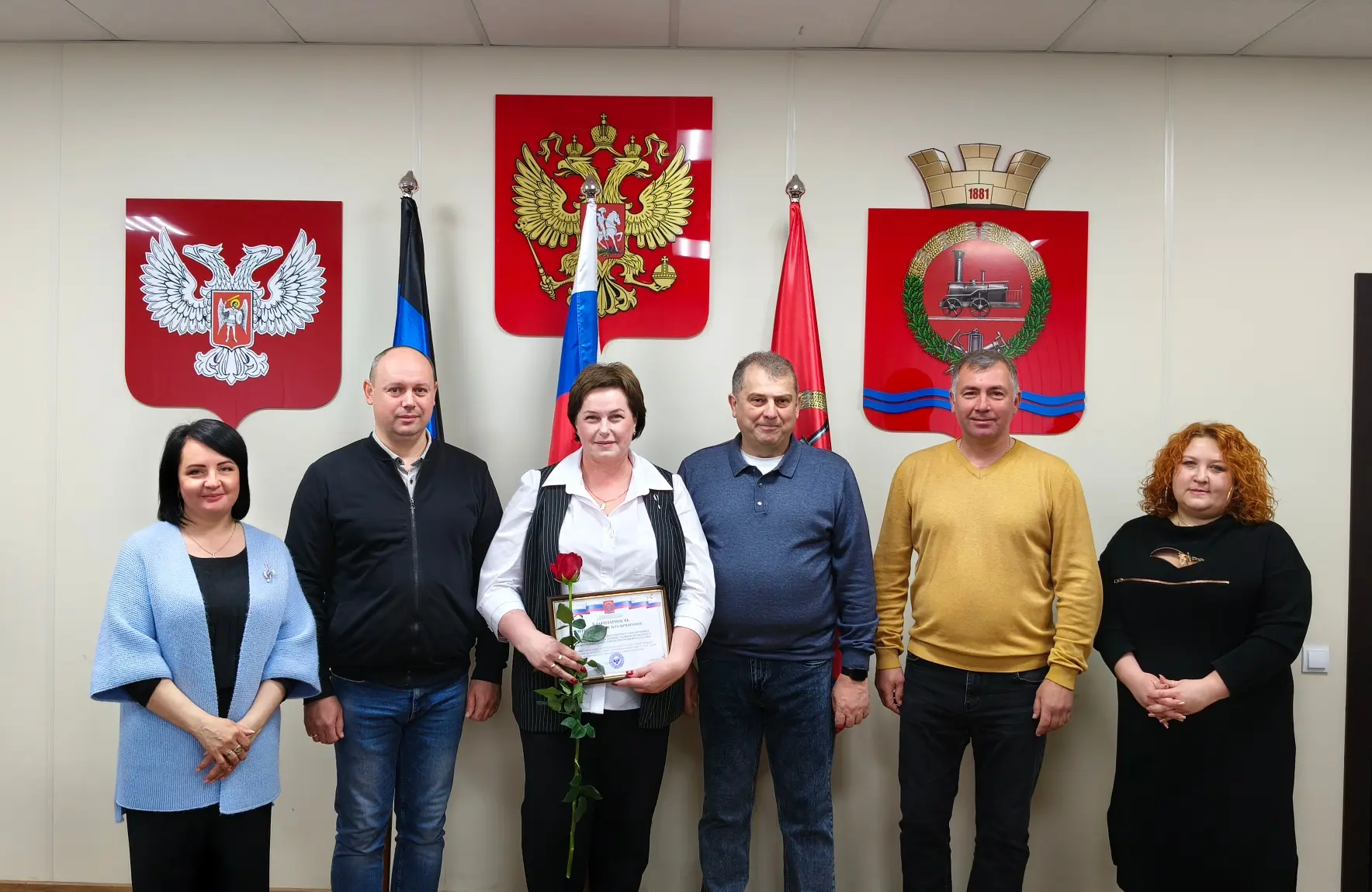 В День местного самоуправления — праздник, объединяющий тех, кто ежедневно трудится во имя развития территорий и повышения качества жизни людей, — состоялась торжественная церемония вручения благодарностей от Главы муниципального образования Константина Зинченко при участии председателя Волновахского муниципального совета, депутата от фракции «Единая Россия» Таймураза Арсоева, Врип главы муниципального образования Ивана Борзых, заместителя главы МО, координатора Женского движения «Единая Россия» Елены Снисаренко, заместителя главы администрации Олега Сидоренко и управляющего делами администрации Марии Васильевой.