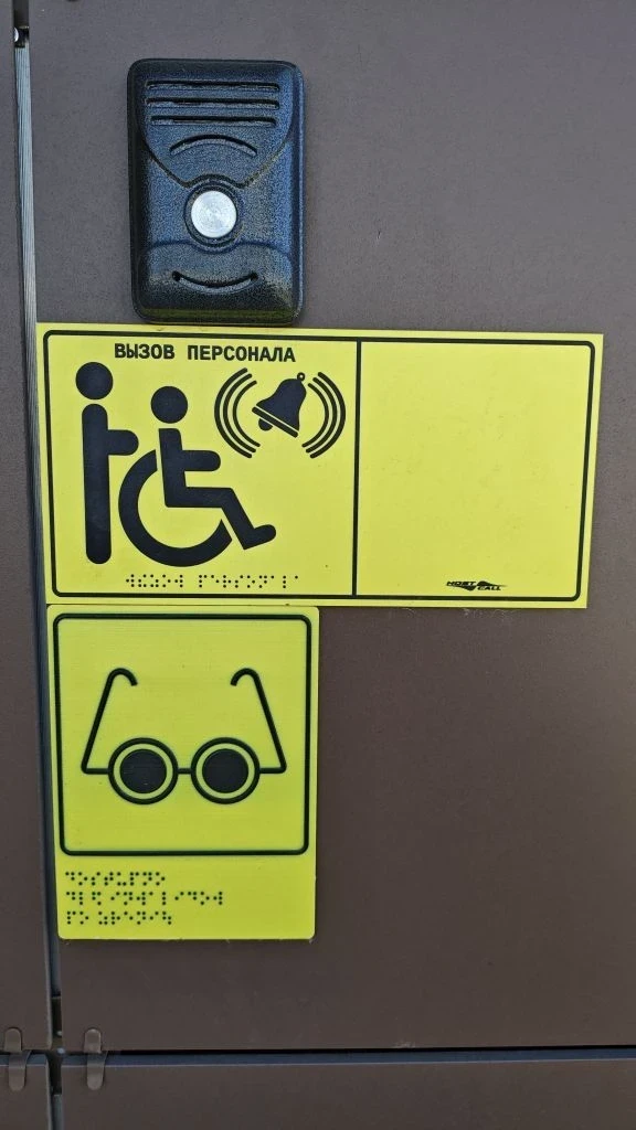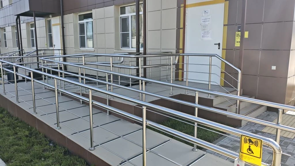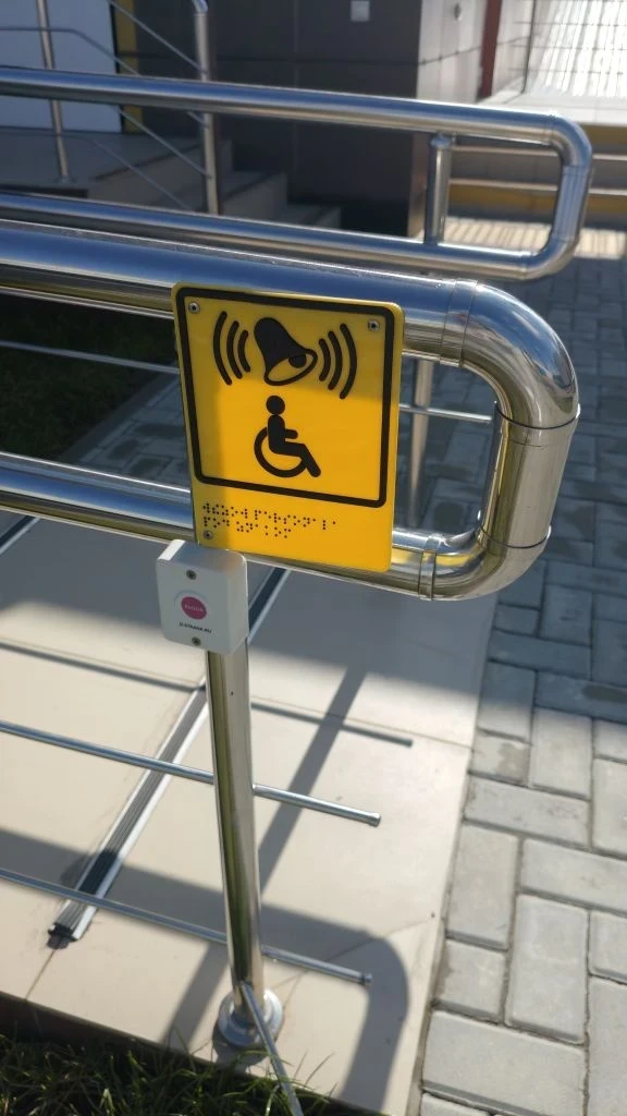 Пандус дополнен прочными перилами, которые непрерывны по всей высоте; имеет не травмирующее завершение; оснащен кнопкой вызова персонала и табличкой со шрифтом Брайля.