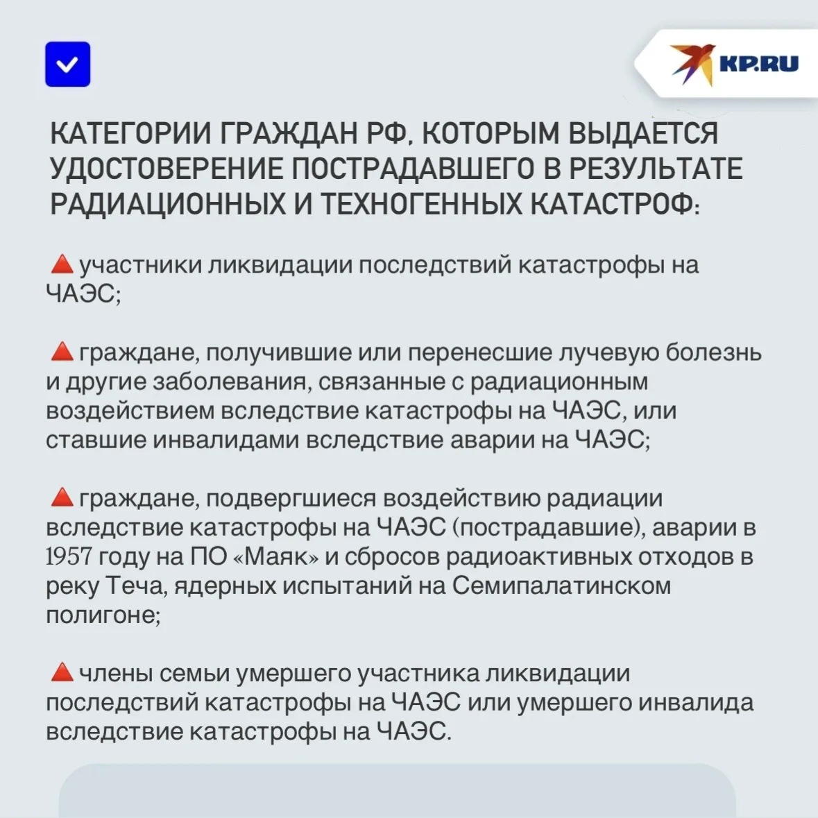 Для получения чернобыльских выплат требуется удостоверение, подтверждающее статус ликвидатора аварии, пострадавшего от радиации или члена семьи ликвидатора или инвалида ЧАЭС.