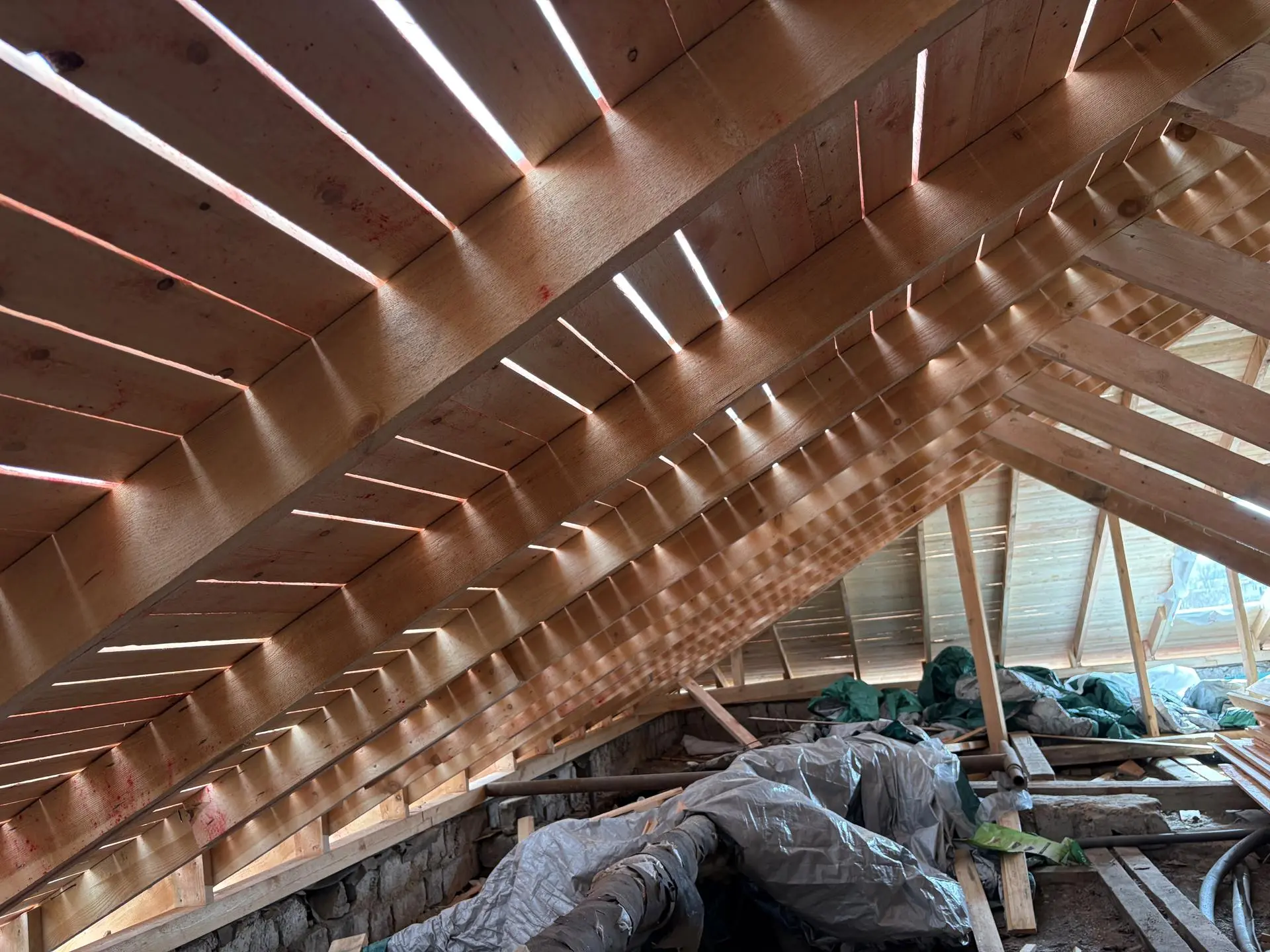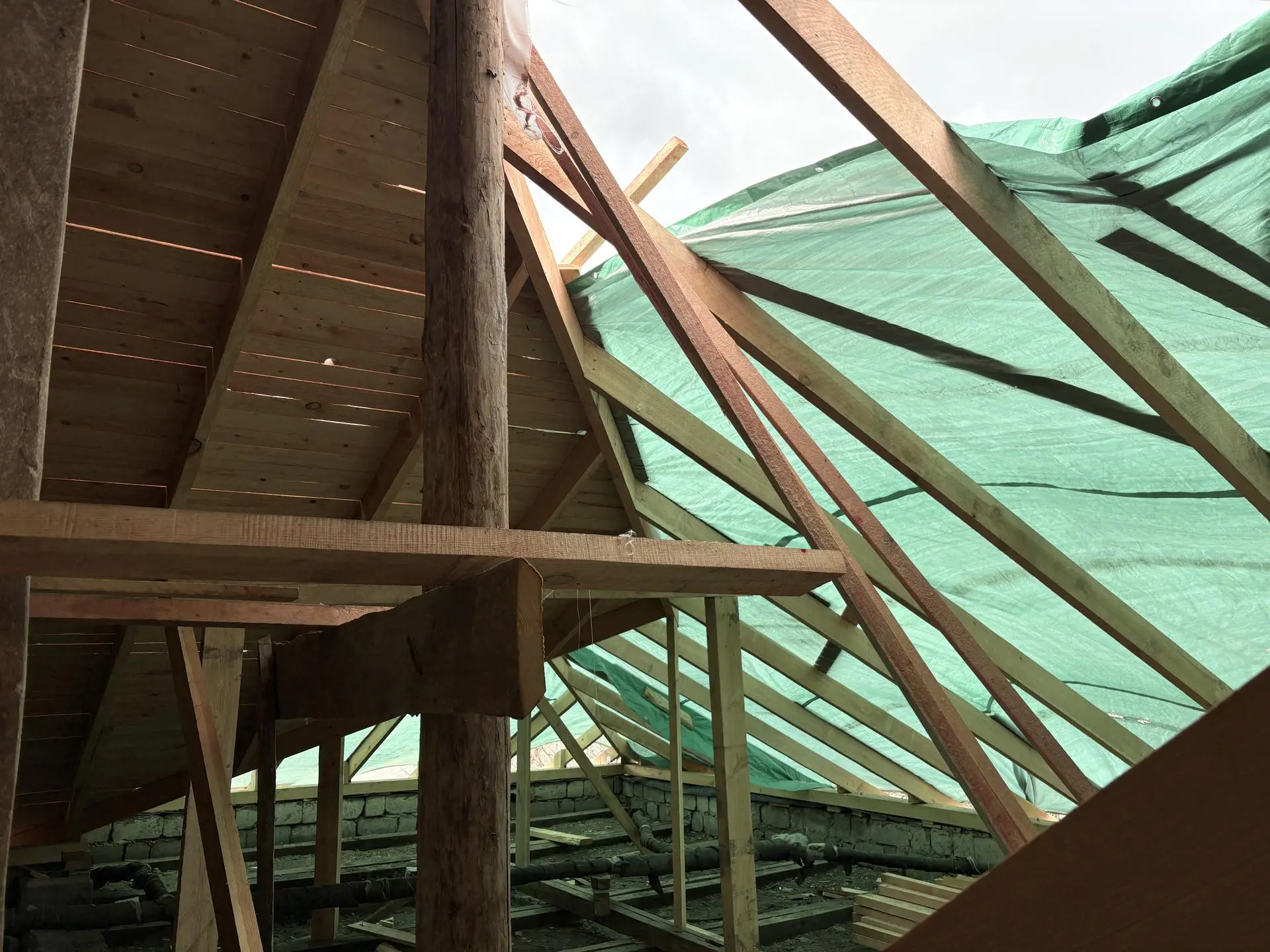 Сейчас рабочие монтируют стропильную систему, обрешетку, контробрешетку и гидроизоляционную пленку.