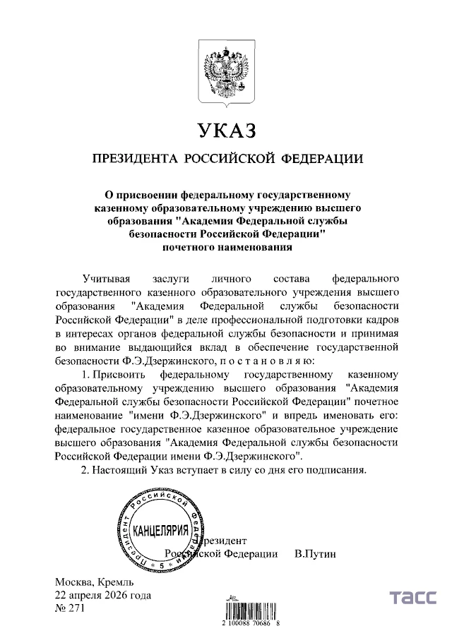 Новости к этому часу:Путин присвоил Академии ФСБ имя Дзержинского. Решение принято с учетом «заслуг личного состава» академии, а также принимая во внимание «выдающийся вклад в обеспечение госбезопасности Ф. Э. Дзержинского», говорится в указе. Это вуз...