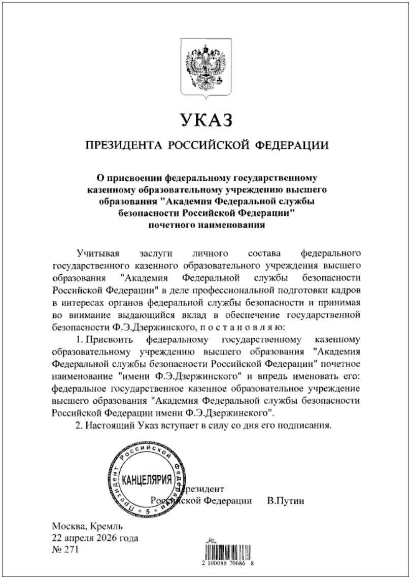 Путин присвоил Академии ФСБ имя Дзержинского. Решение принято с учетом «заслуг личного состава» академии, а также принимая во внимание «выдающийся вклад в обеспечение госбезопасности Ф. Э. Дзержинского», говорится в указе. Это вуз носил имя Дзержинского с 1962 по 1992 год – тогда он назывался Высшей школой КГБ СССР.
