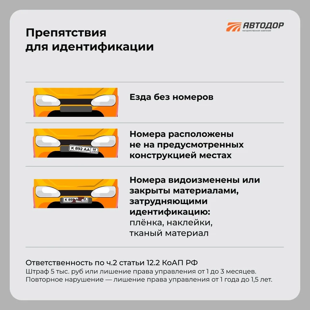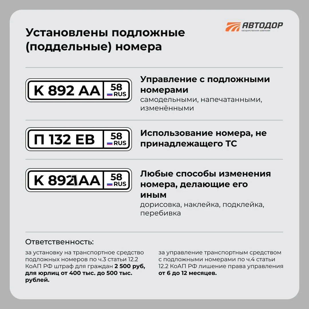 Коллеги из Госкомпании «Автодор» собрали информацию о том, что грозит водителям, передвигающимся на транспортных средствах с подложными, нечитаемыми, нестандартными или установленными с нарушением номерами.