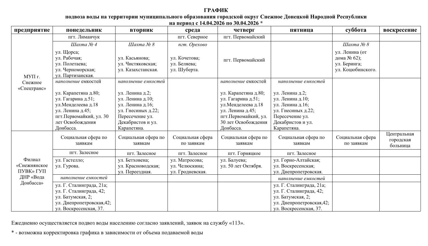 Напомним график подвоза воды на территории муниципального образования городской округ Снежное на период с 14.04.2026 по 30.04.2026