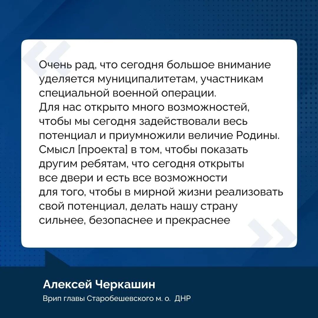 «Сегодня на передовую муниципального служения с боевой передовой приходят ветераны специальной военной операции. Их готовность принимать ответственные решения способна повысить эффективность власти муниципального уровня. Они уже успешно работают на самых разных должностях», —