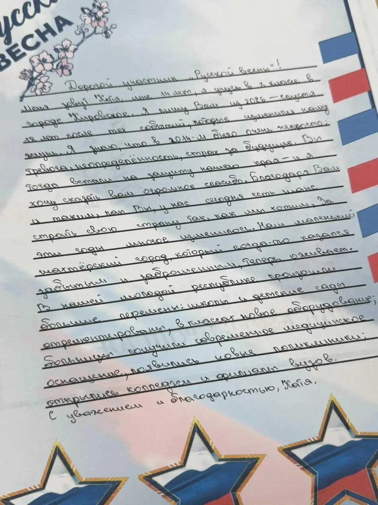 Особенным получилось письмо 14-летней Кати – простым, честным, написанным без лишних слов, но с большим сердцем. Девочка обратилась к тем, кто в трудный момент сделал выбор в пользу защиты родного края.