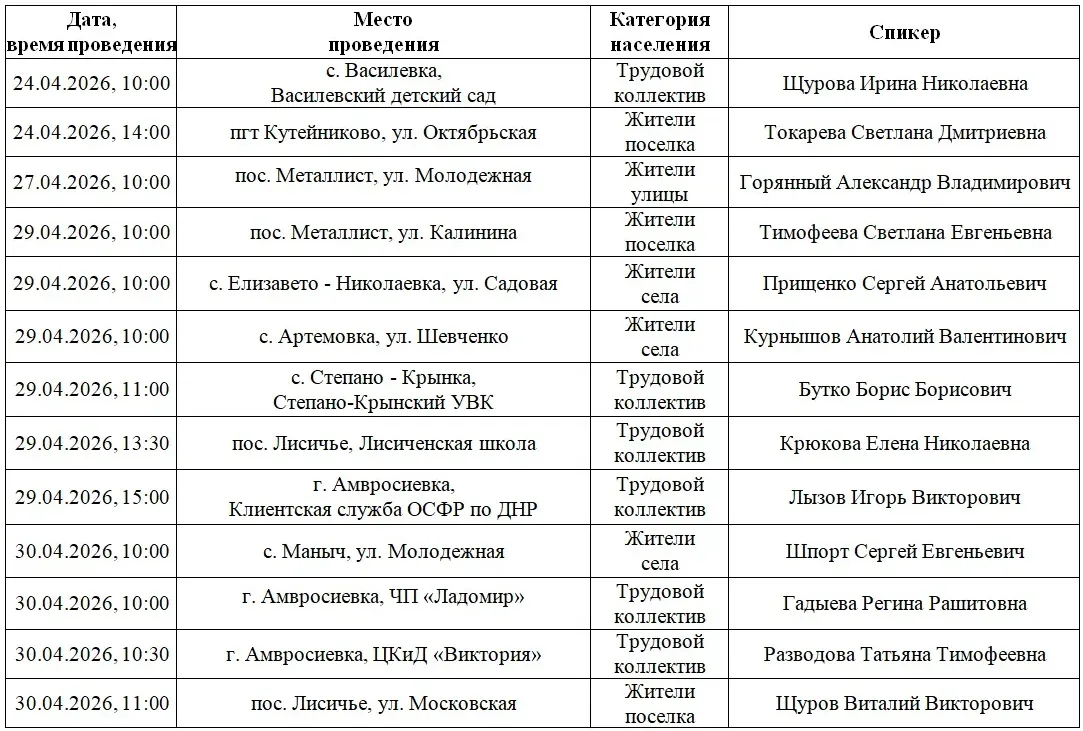График проведения встреч с населением на подведомственных территориях руководящим составом администрации Амвросиевского муниципального округа, начальниками территориальных отделов администрации округа с 24 по 30 апреля