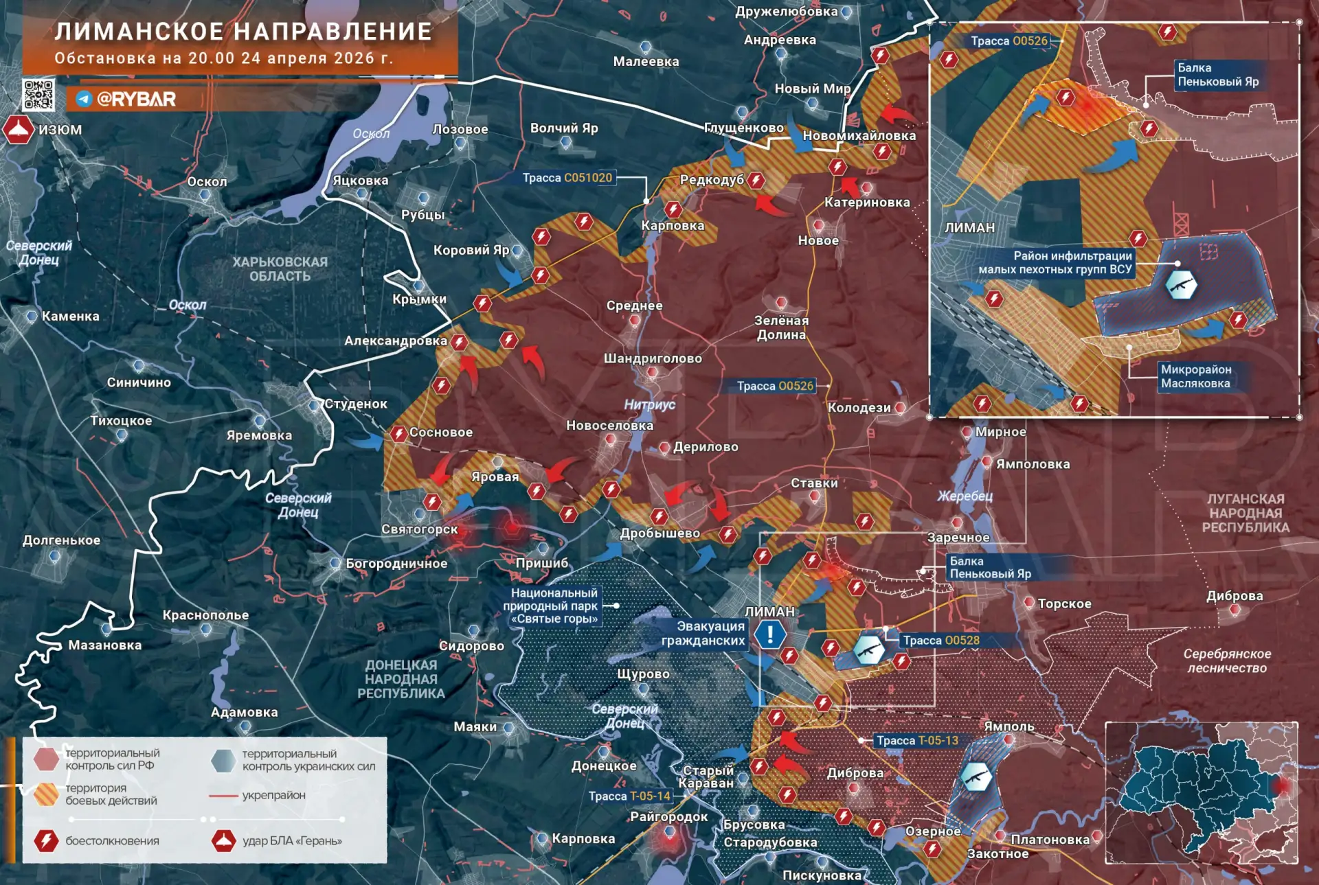 На Лиманском направлении украинские формирования предпринимают контратаки в окрестностях Ставков и пытаются вернуть контроль над позициями в балке Пеньковый Яр. Параллельно с этим продолжаются бои в районе Святогорска и парке «Святые горы».