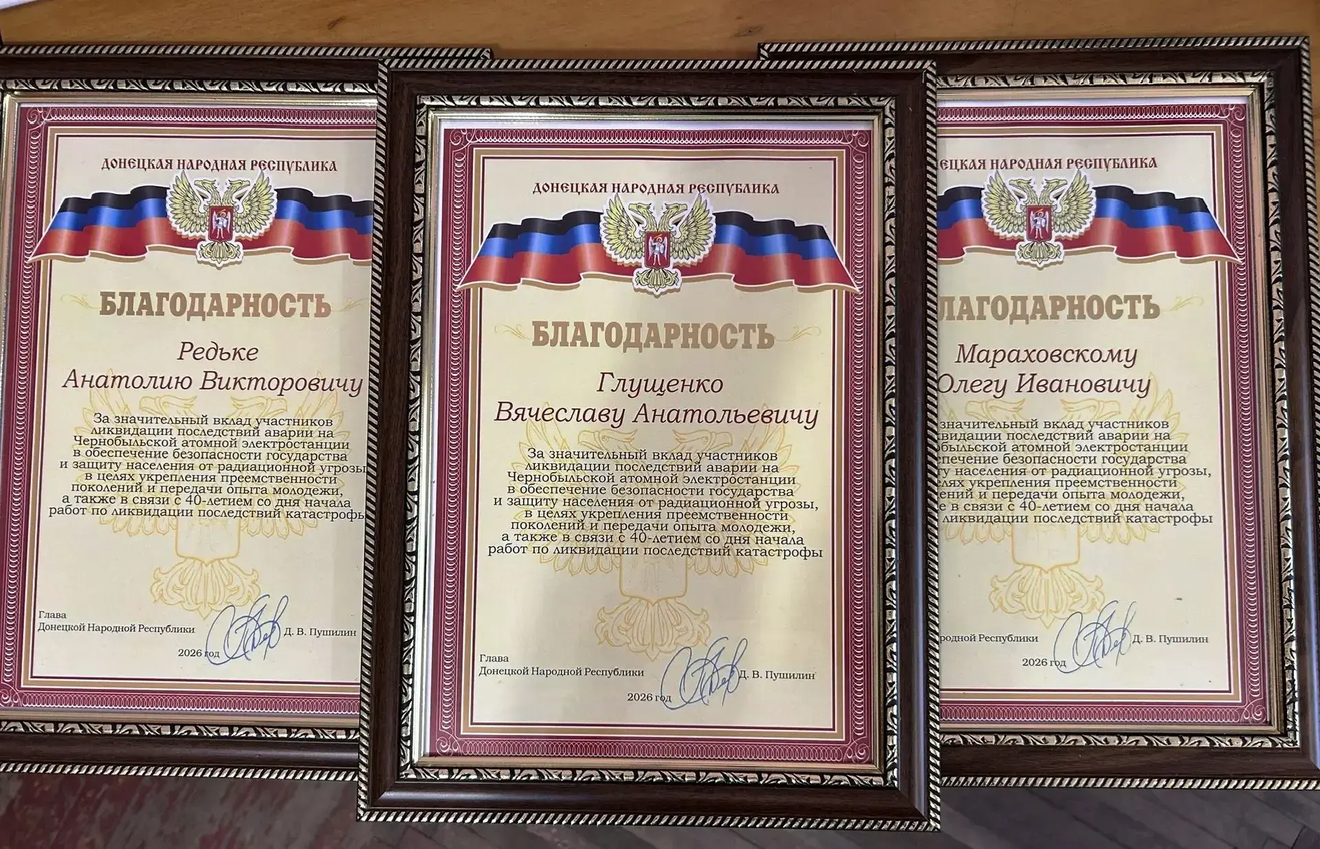 Также жители Калининского района, участвовавшие в ликвидации последствий трагедии, были отмечены Благодарностями от имени Главы Донецкой Народной Республики Дениса Владимировича Пушилина.