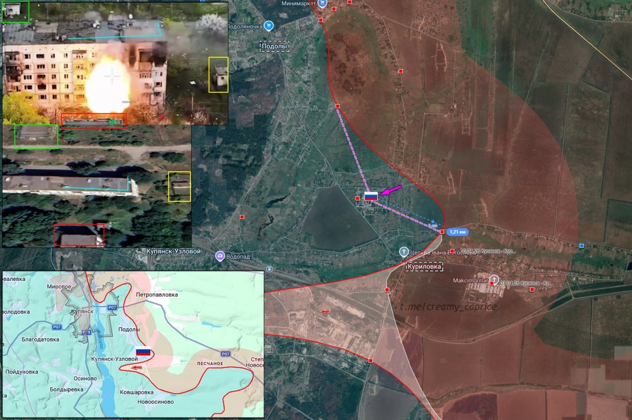 Позиция ВС РФ в комплексе многоэтажных зданий в окрестностях Куриловки подверглась обстрелу ВСУ. ВС РФ увеличили зону контроля более 1 км и заняли помещения на территории заброшенного военного городка.