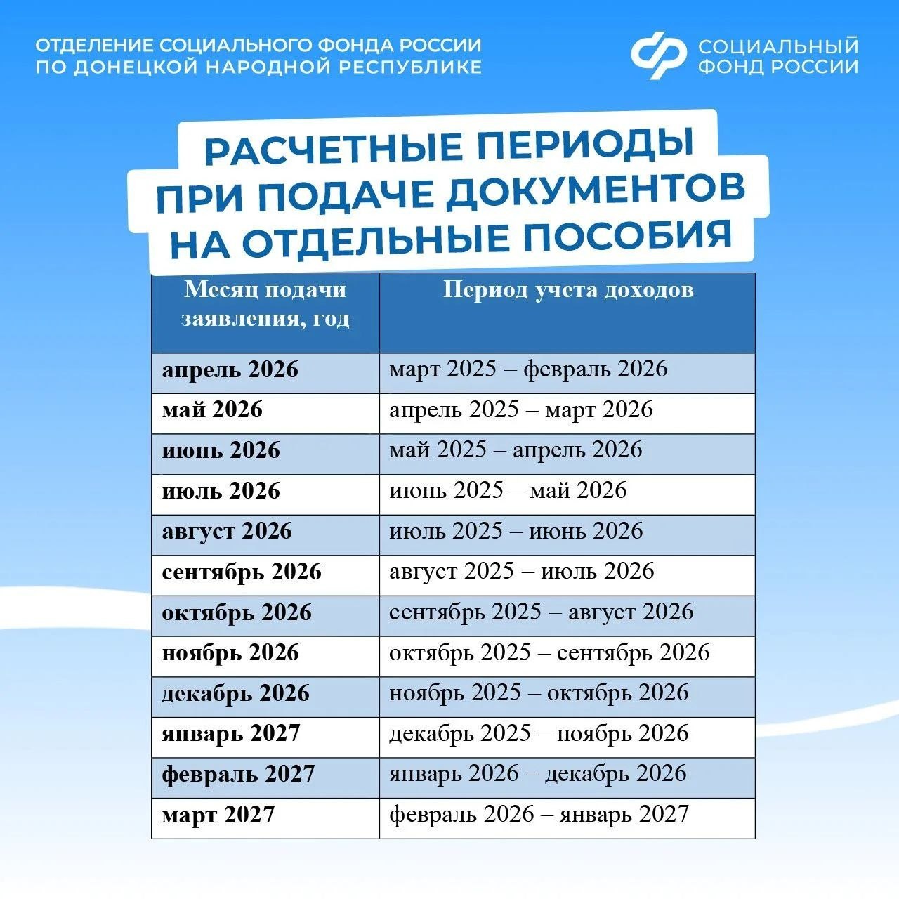 Расчетный период для определения среднедушевого дохода семьи из Донецкой Народной Республики при назначении единого пособия на детей — 12 месяцев, но отсчет этого периода начинается за 1 месяц до даты подачи заявления.