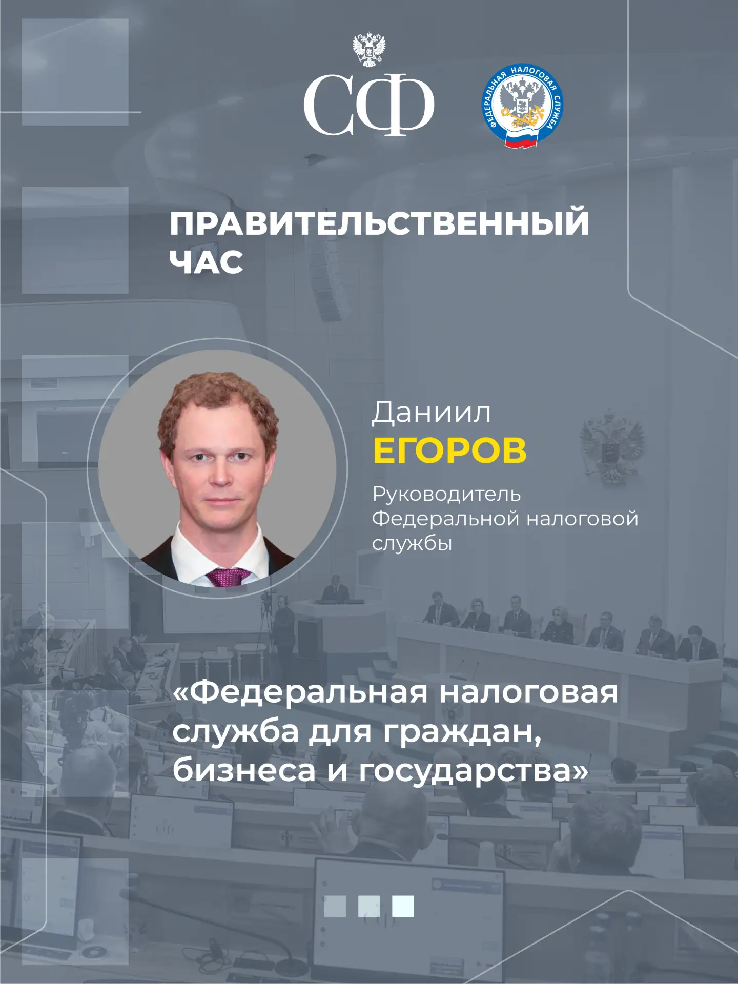 В 11.00 в рамках Правительственного часа перед сенаторами выступит руководитель Федеральной налоговой службы Даниил Егоров с докладом на тему «Федеральная налоговая служба для граждан, бизнеса и государства».