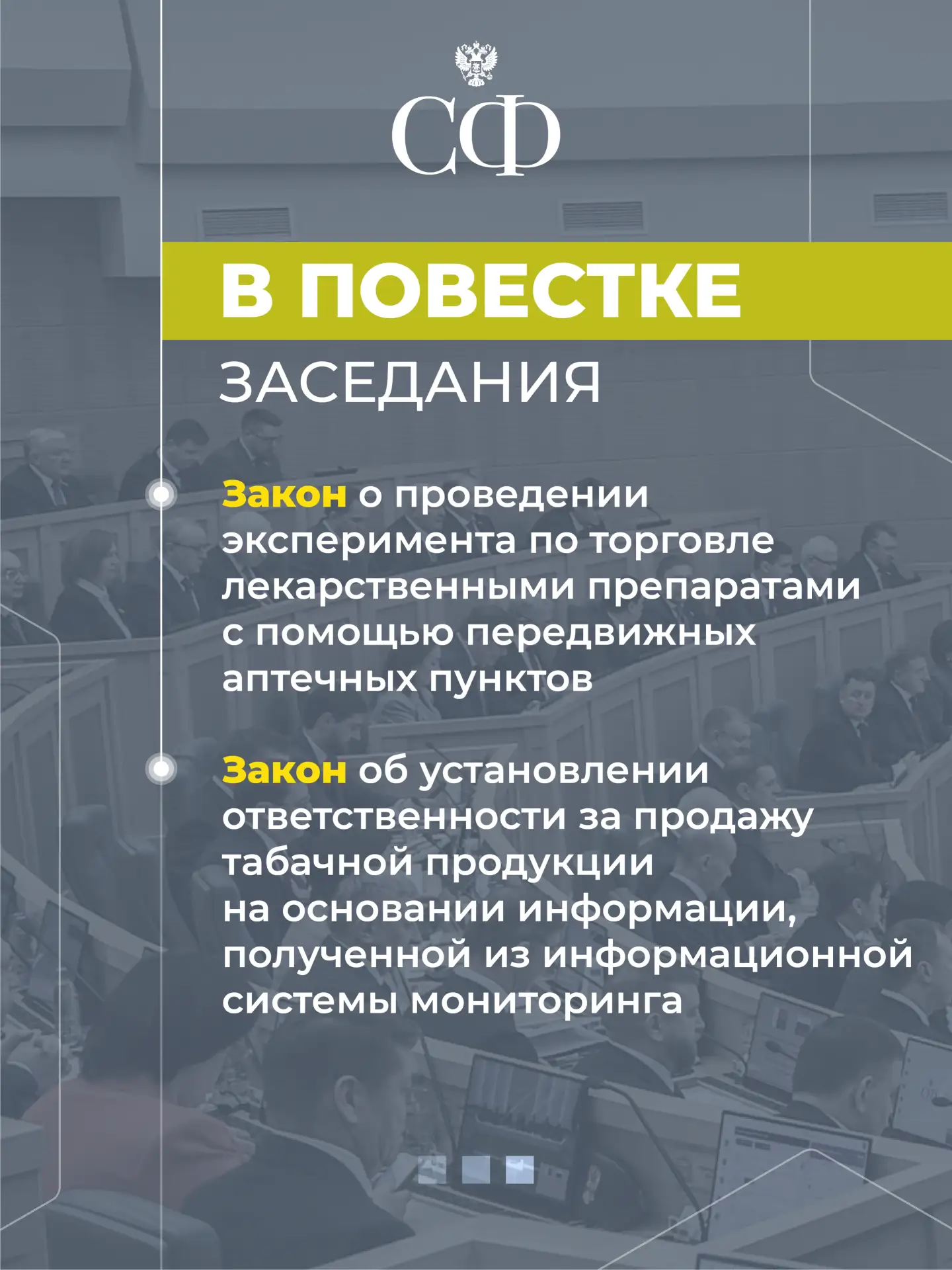 Сенаторы рассмотрят поправки в закон «Об обращении лекарственных средств», предусматривающие проведение эксперимента по осуществлению розничной торговли лекарственными препаратами для медицинского применения с помощью передвижных аптечных пунктов.