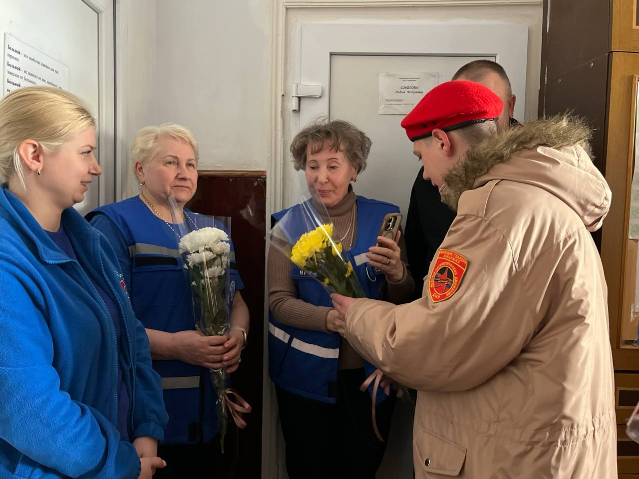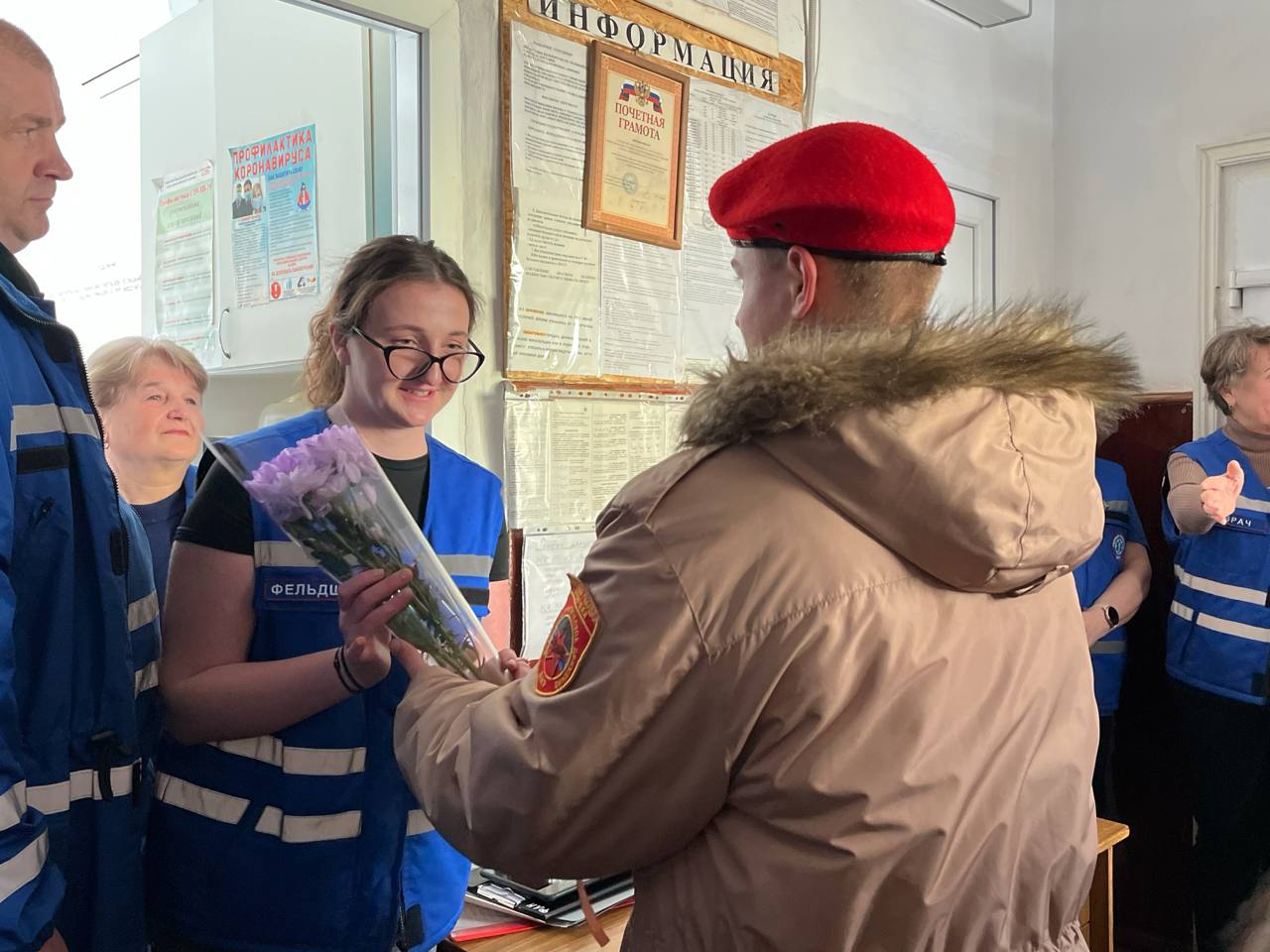 Сегодня юнармейцы отряда ВПК «Пламя» штаба местного отделения городского округа Харцызска СШ № 4, ученики из 9-А класса Мокровуз Виктория, Муляр Анастасия, Воробьев Сергей и Бесчаснов Давидсовместно с руководителями местного отделения ВВПОД «ЮНАРМИЯ» ДНР «МОЛОДАЯ ГВАРДИЯ-ЮНАРМИЯ»: начальник отделения Андрей Викторович Субботин и младшим специалист по структурному развитию София Сергеевна Субботина пришли на станцию скорой помощи, чтобы поздравить сотрудников с их профессиональным праздником.