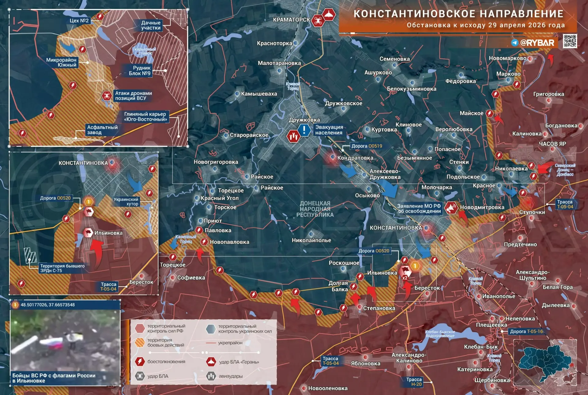На Константиновском направлении штурмовики заканчивают зачистку Ильиновки, ведут бои в центре Константиновки. Восточнее ВСУ все еще удерживают позиции на окраине Часова Яра, поступают сообщения об освобождении Новодмитровки.