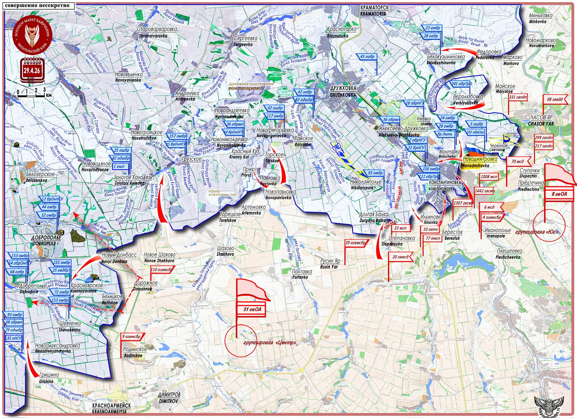 29 апреля российскими войсками был освобожден поселок Новодмитровка (48°3245 с. ш. 37°4350 в. д. - население 415 чел. в 2001 г.) в районе водохранилища Молочарка, с охватом левого фланга обороняющейся в городе группировки ВСУ.