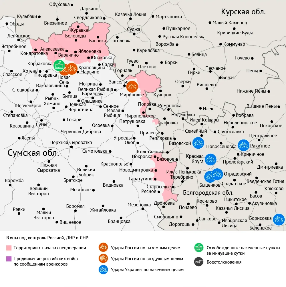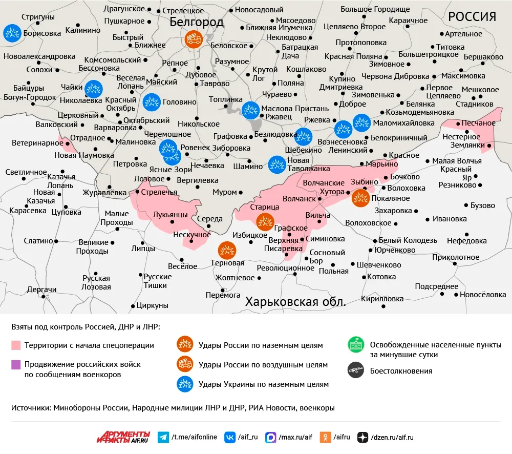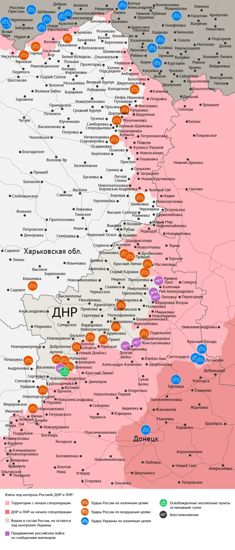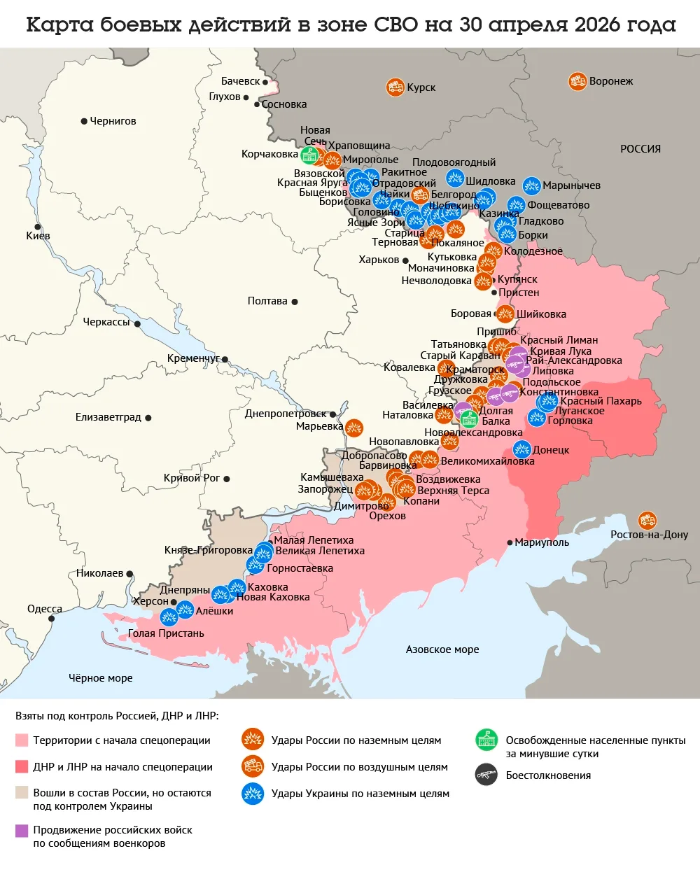 По данным Минобороны, ВС РФ освободили село Новоалександровка в ДНР, создавая угрозу охвата Доброполья с запада. Кроме того, 30 апреля наши военные окончательно выбили противника из населенного пункта Корчаковка в Сумской области.